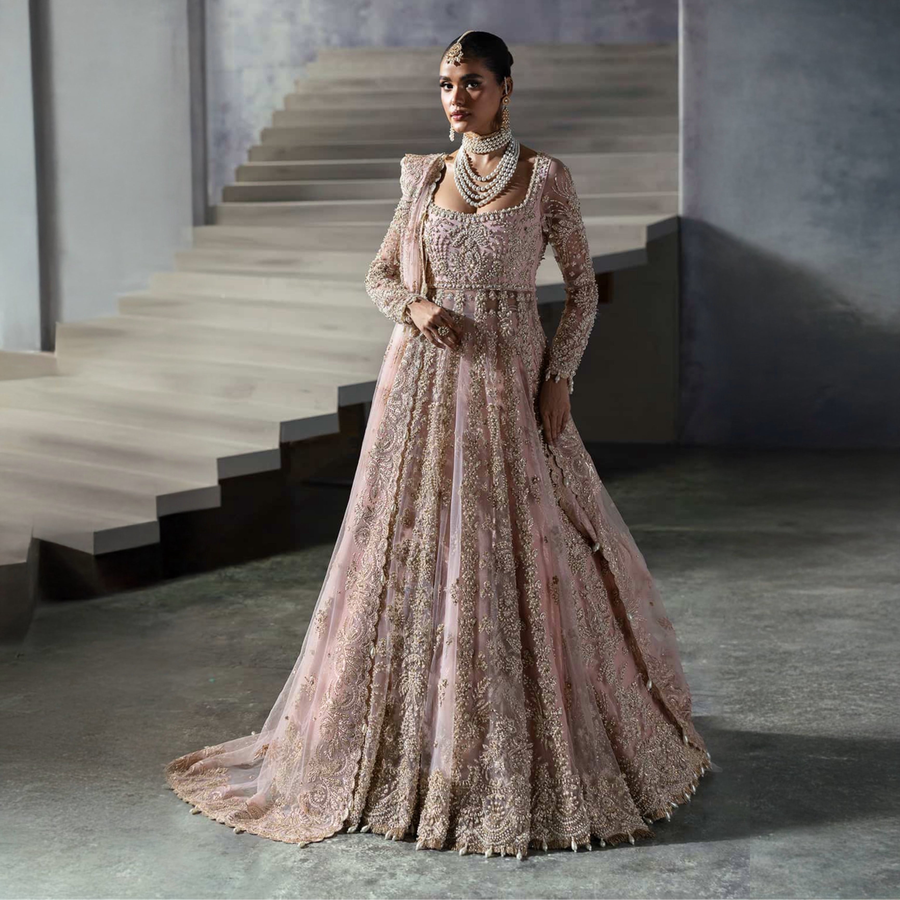This elegant peshwas/maxi is crafted from fine net fabric, featuring 14 flowing panels that create a graceful, regal silhouette. It comes with a 2.5-meter dupatta finished with four-side borders, excluding the front for a clean, balanced look. The pallu is with luxurious detailing, adding a touch of glamour and sophistication. Paired with a 2.5-yard trouser in rich PK raw silk, this ensemble is perfect for festive occasions, weddings, or formal events—effortlessly blending tradition with timeless style.