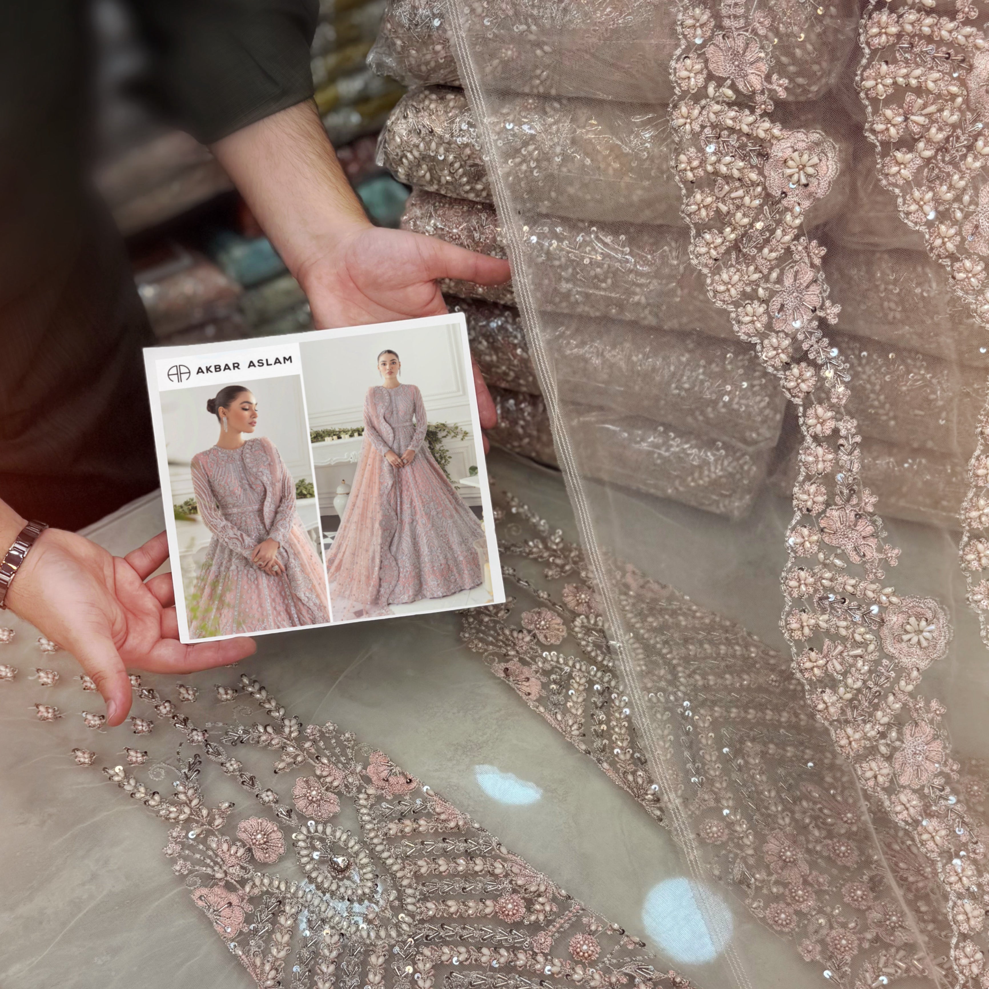 This elegant peshwas/maxi is crafted from fine net fabric, featuring 16 flowing panels that create a graceful, regal silhouette. It comes with a 2.5-meter dupatta finished with four-side borders, excluding the front for a clean, balanced look. The pallu is fully hand-embellished with luxurious detailing including pearls, stones, Cutdana, and sequins, adding a touch of glamour and sophistication. Paired with a 2.5-yard trouser in rich PK raw silk, this ensemble is perfect for festive occasions, weddings, or formal events—effortlessly blending tradition with timeless style.