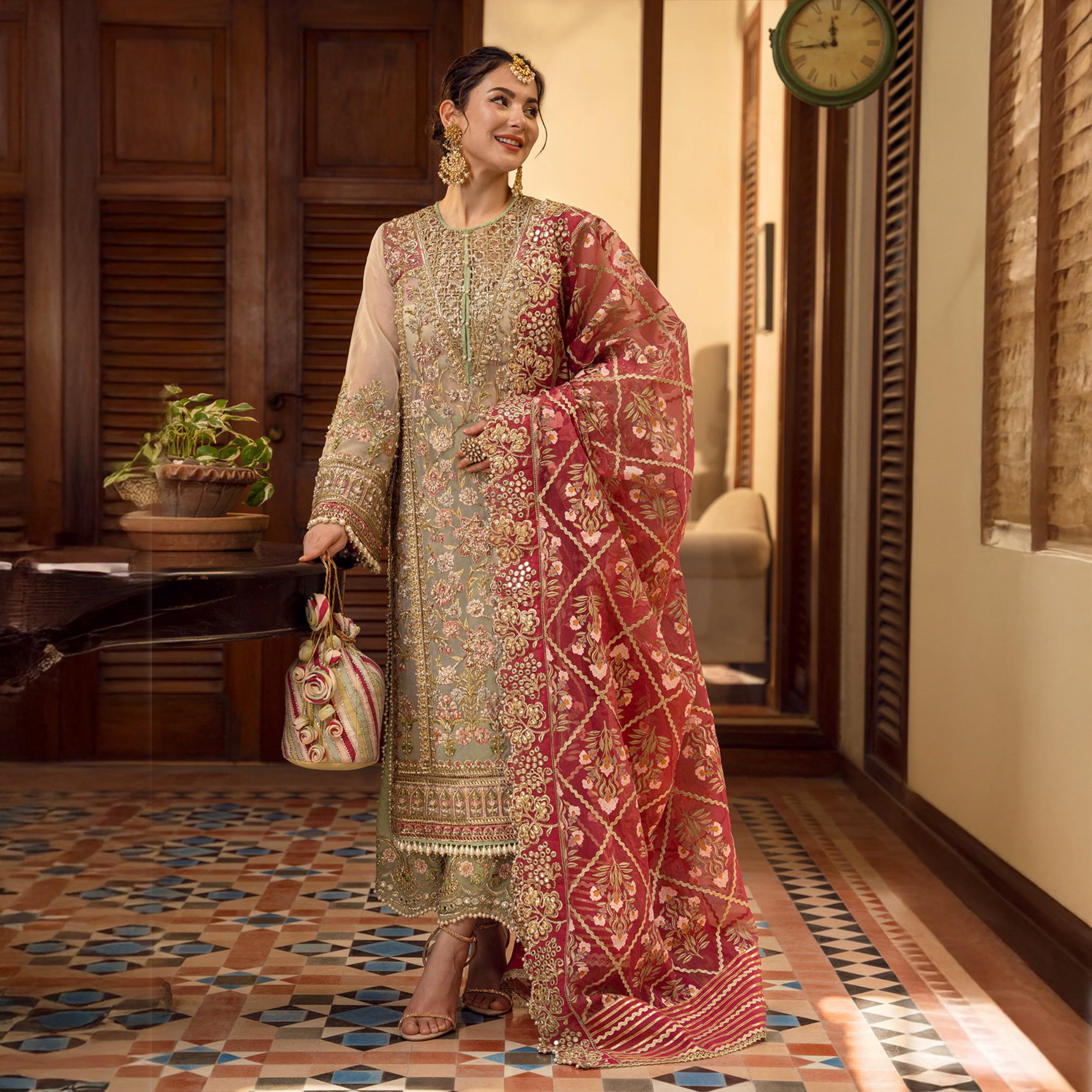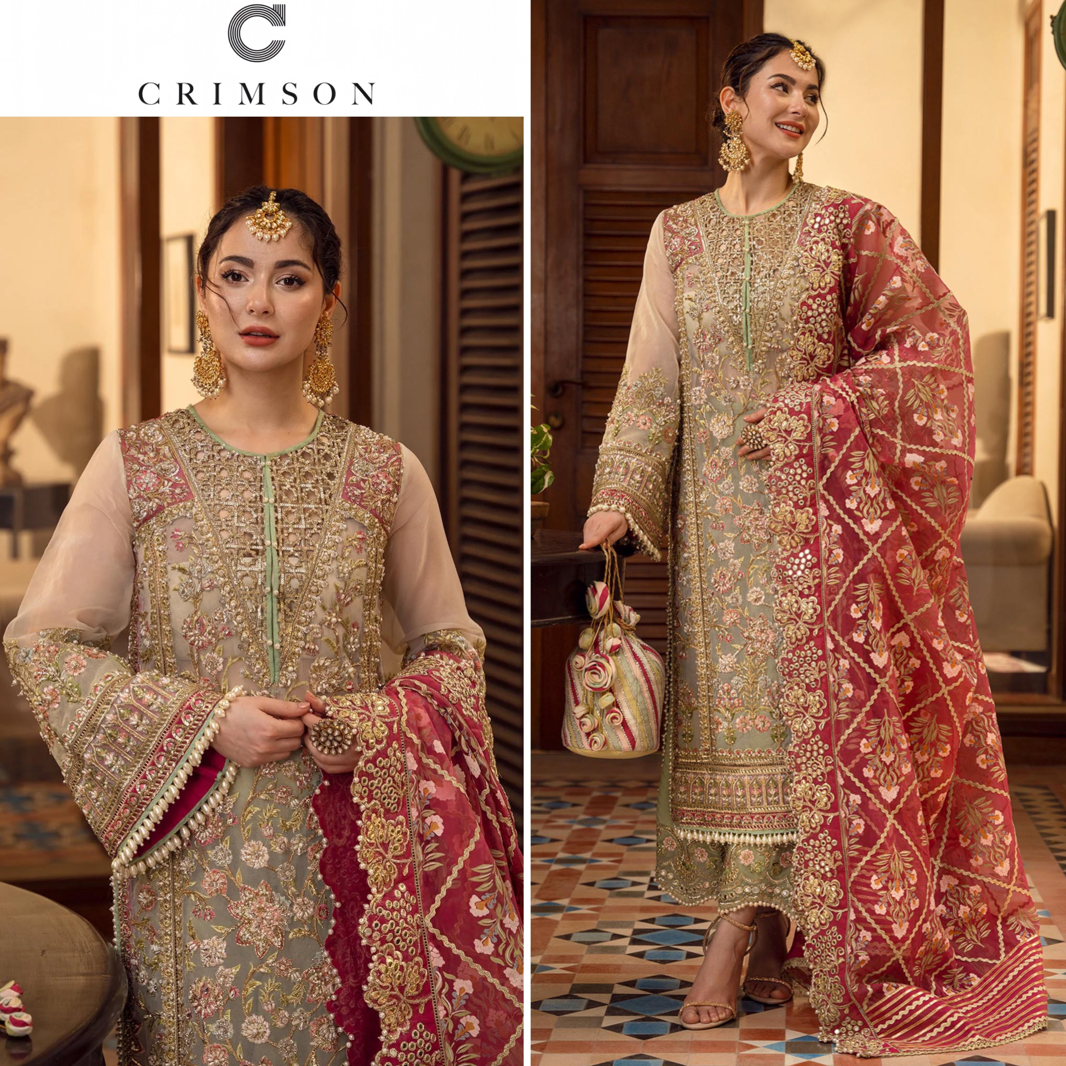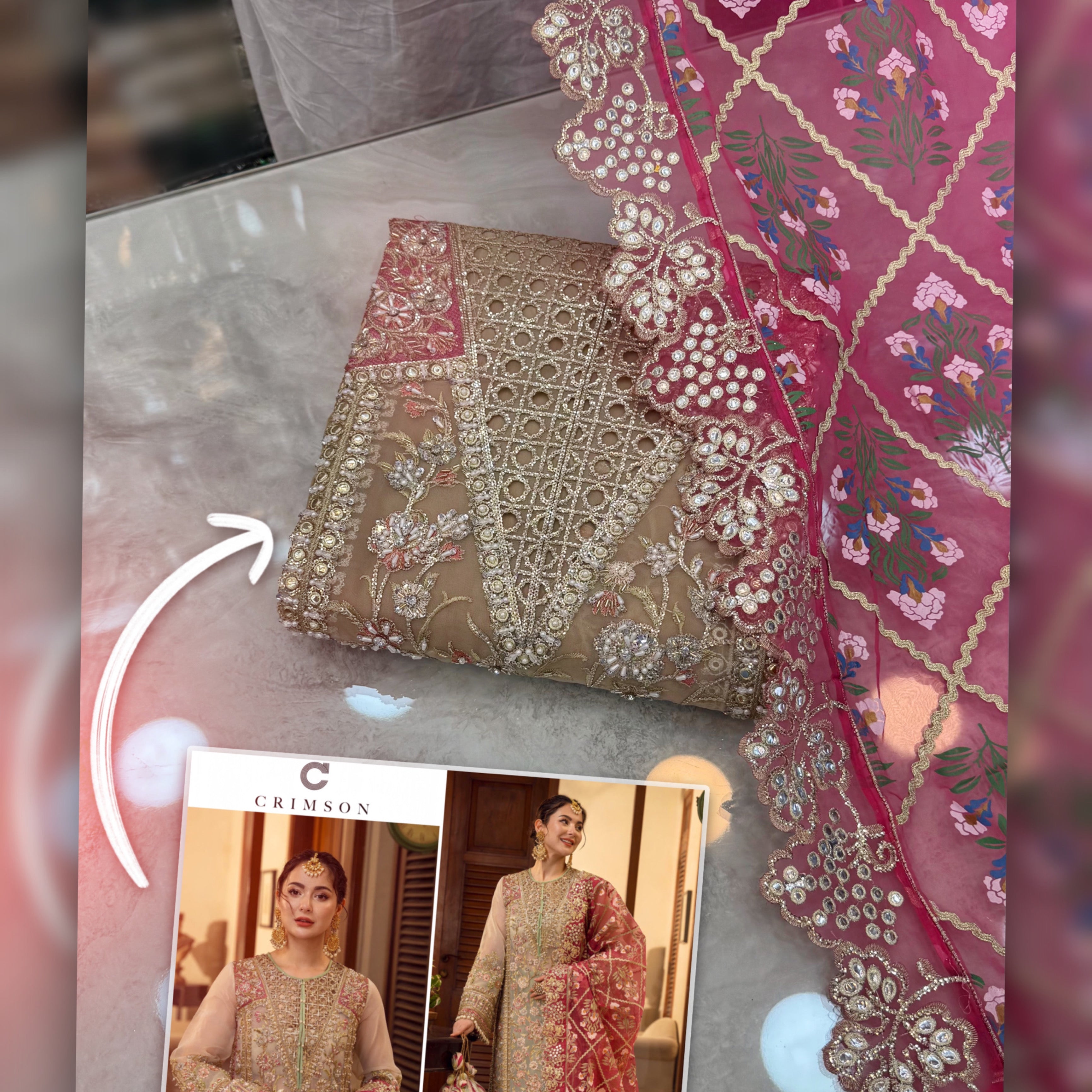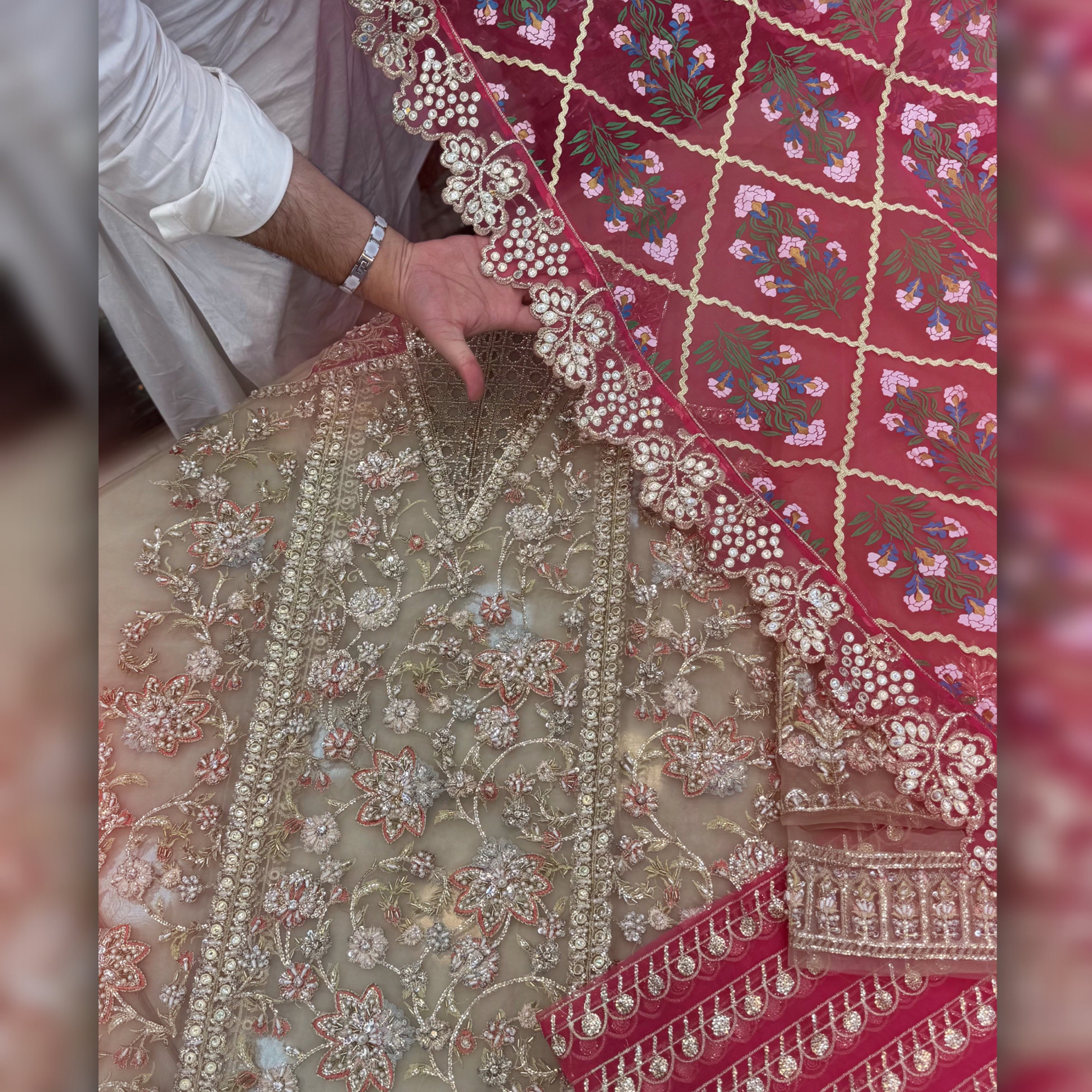 Organza Shirt , Embalishment , Embroidered and Sequined paired with Russina grip Plazzo embalished with beads, pearls on boarders & 3D printed Oraganza dupatta.