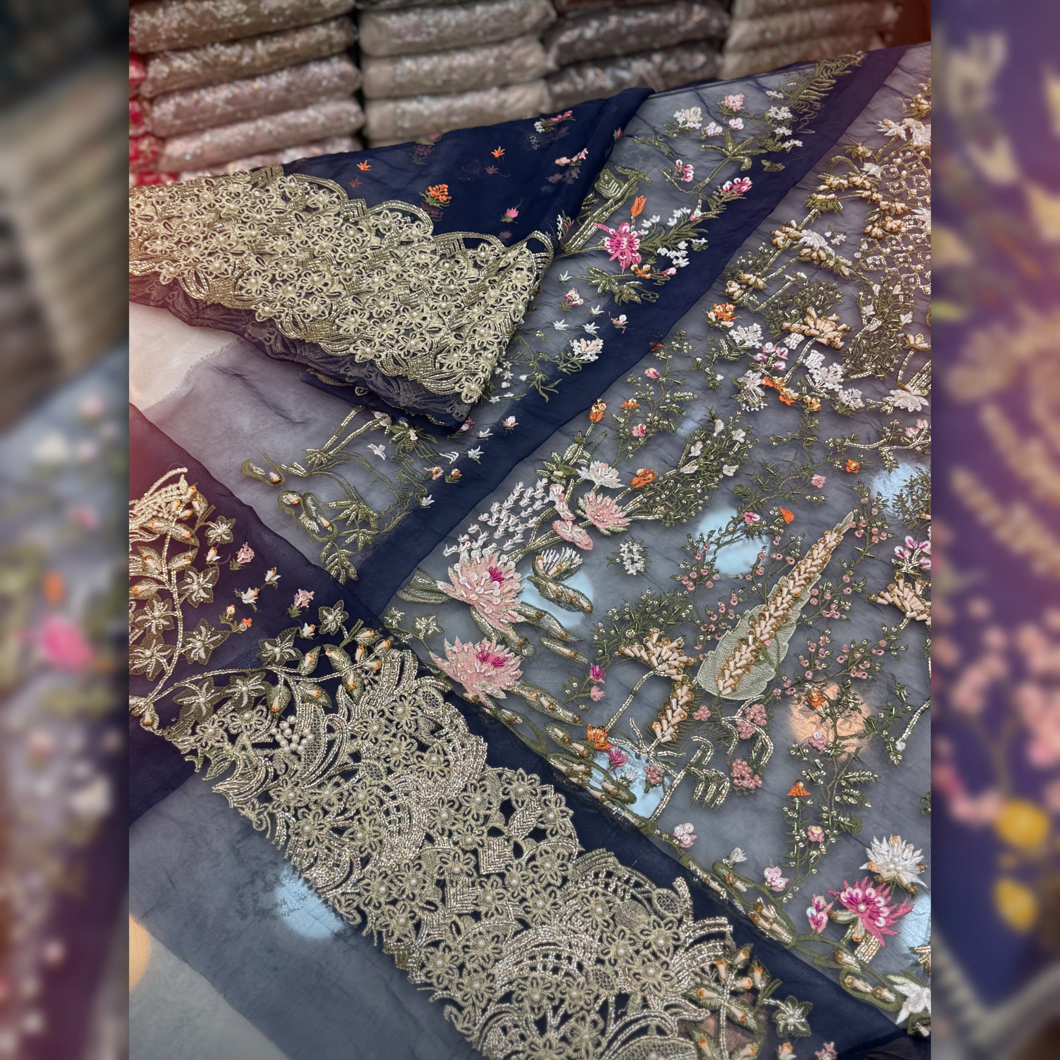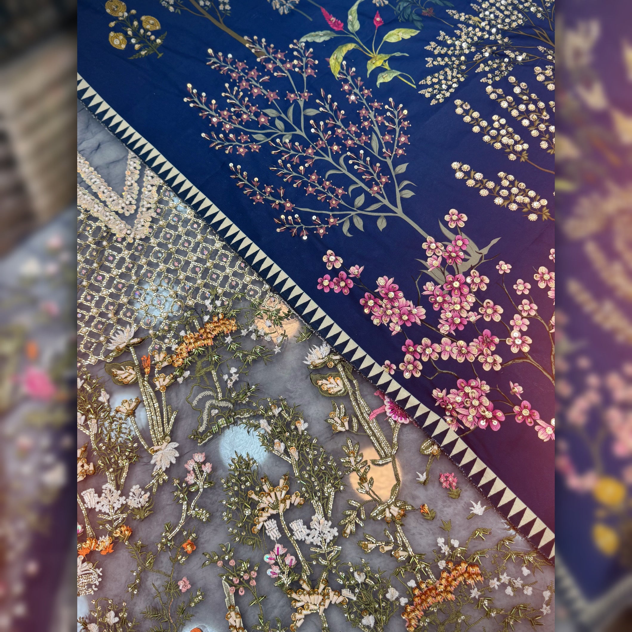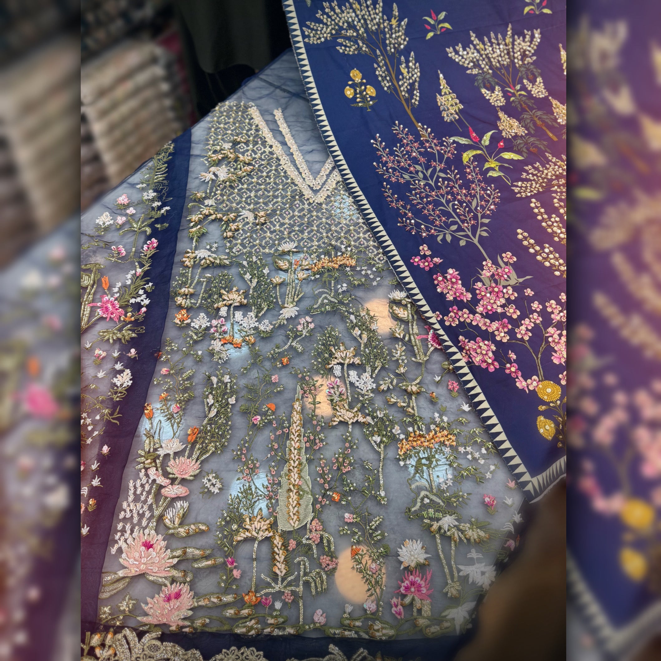 This elegant suit is crafted from luxurious organza fabric, featuring intricate hand-embellished detailing on both the shirt and the accompanying organza shawl. The ensemble comes complete with 2.5 yards of premium Pakistani raw silk trousers, and the shirt is adorned with delicate multi-thread sequin work, adding a touch of glamour and sophistication.
