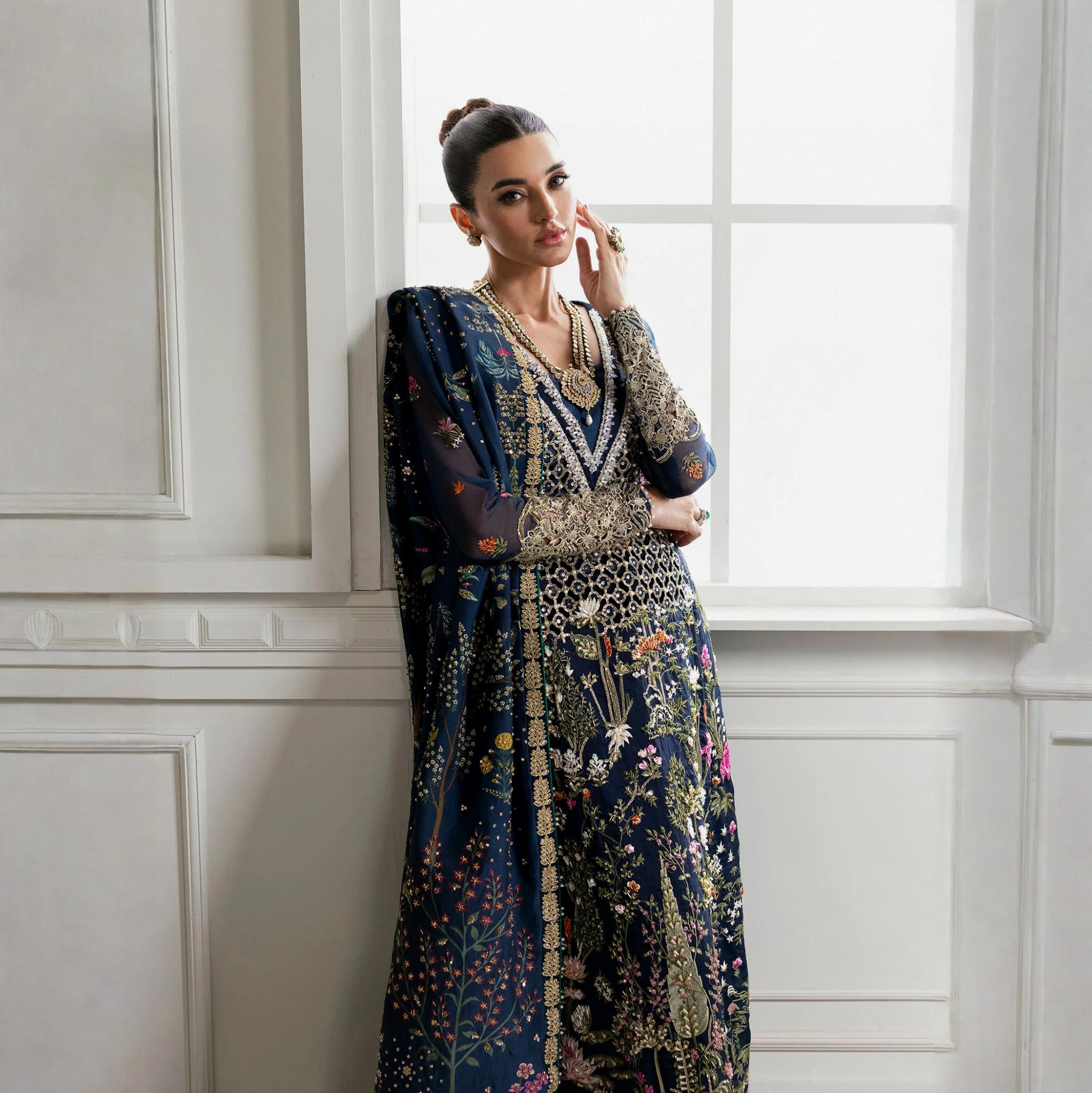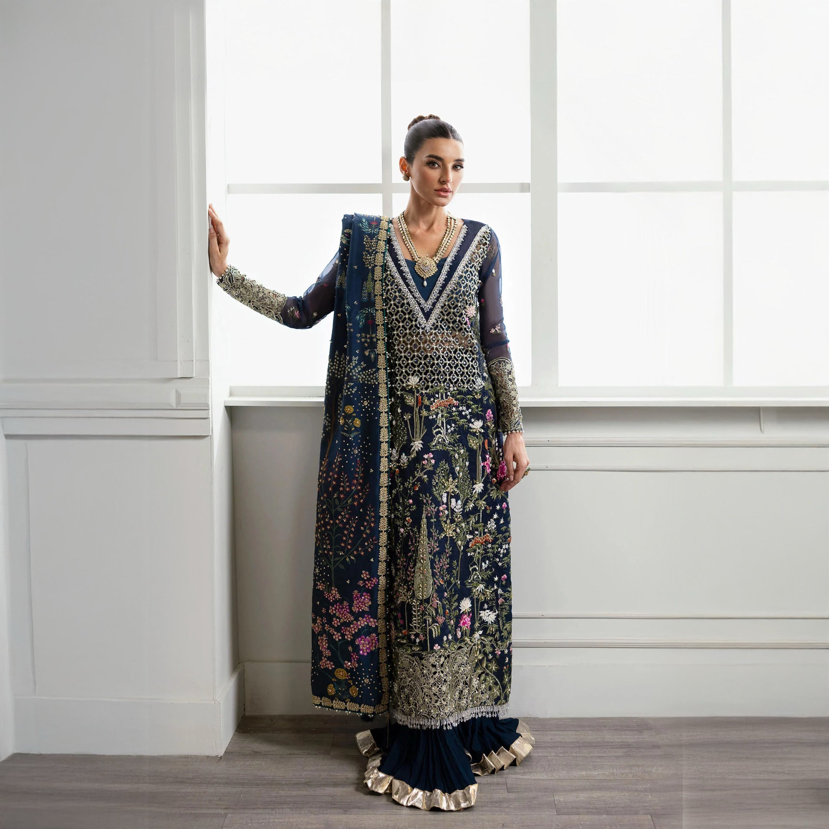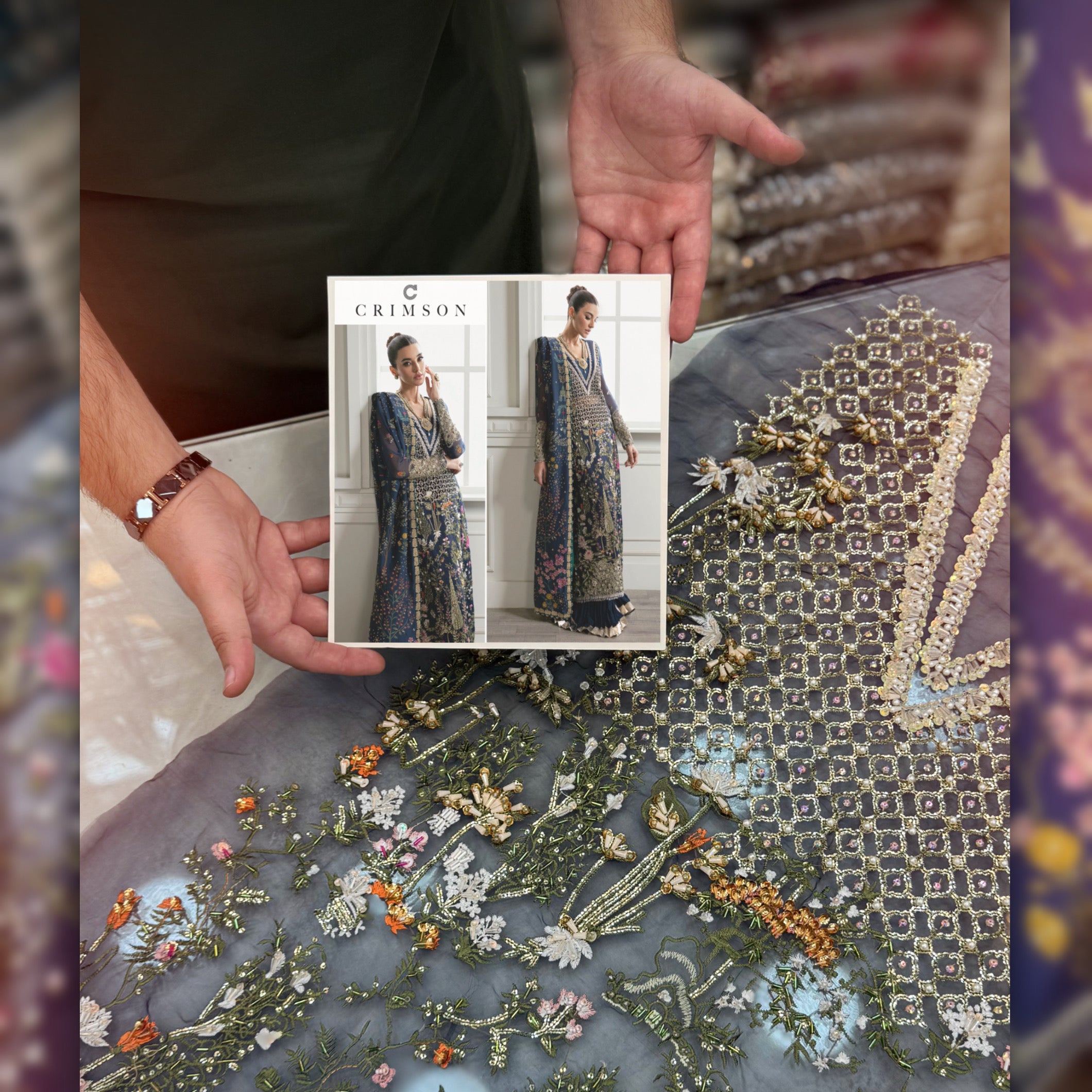 This elegant suit is crafted from luxurious organza fabric, featuring intricate hand-embellished detailing on both the shirt and the accompanying organza shawl. The ensemble comes complete with 2.5 yards of premium Pakistani raw silk trousers, and the shirt is adorned with delicate multi-thread sequin work, adding a touch of glamour and sophistication.