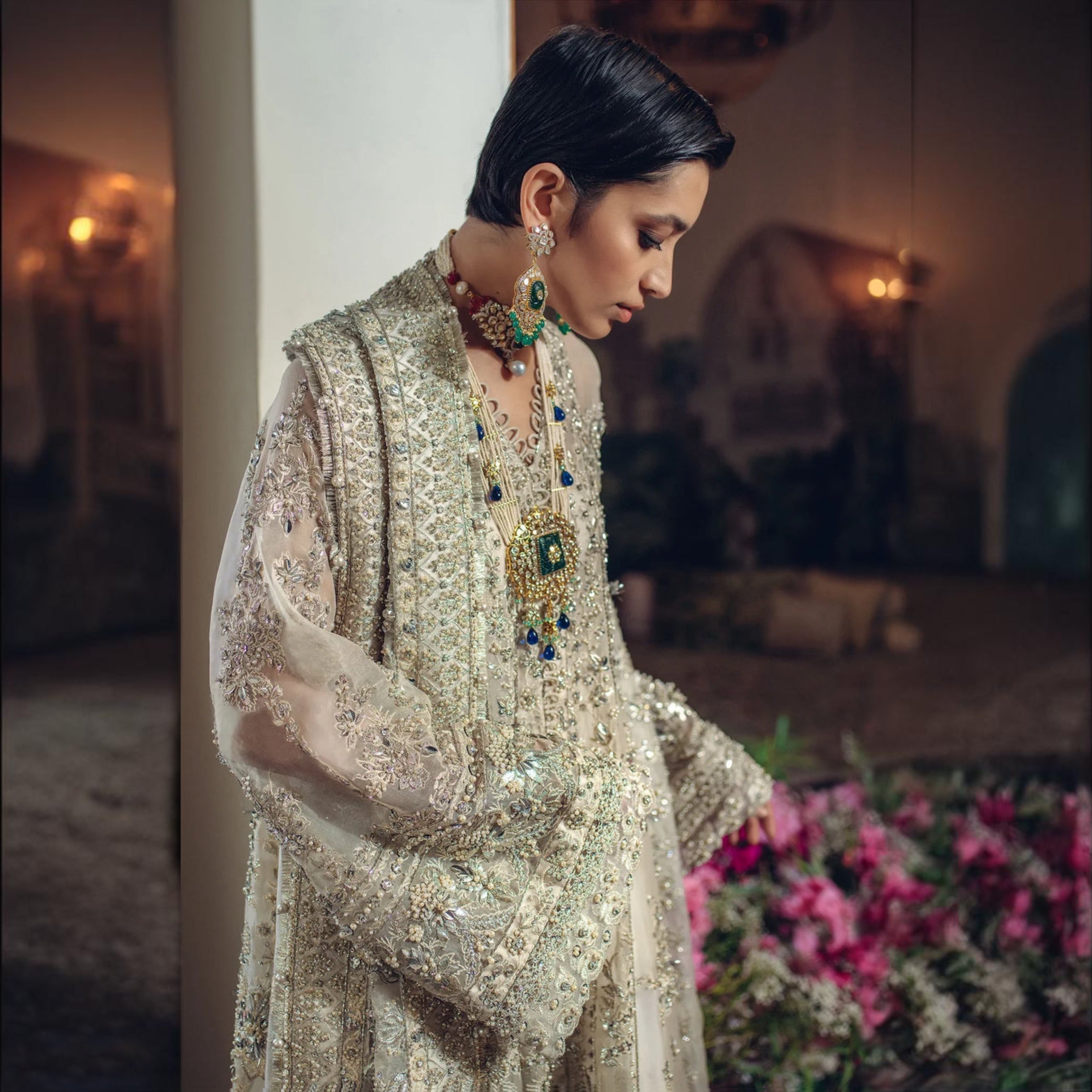 Detailed florals bloom in moonlit tendrils on the dreamy ivory organza canvas of “Reine Blanche”, luxuriously laden with iridescent sequin, sparkling crystal and oyster pearls creating an ethereal impact. Paired with a diaphanous organza dupatta emblazoned with filigreed bootis, elaborately detailed borders and dramatically accented pants, this look is reminiscent...