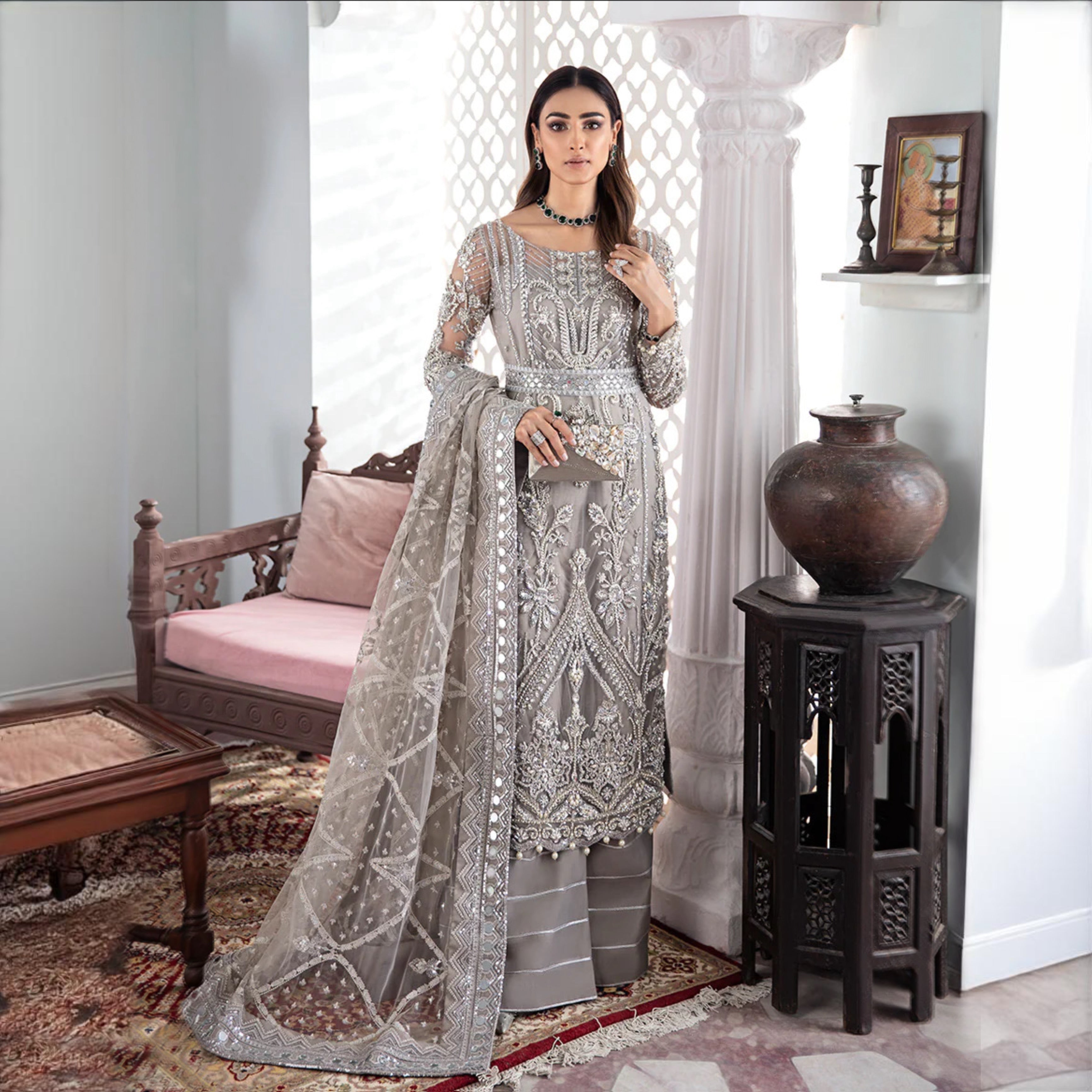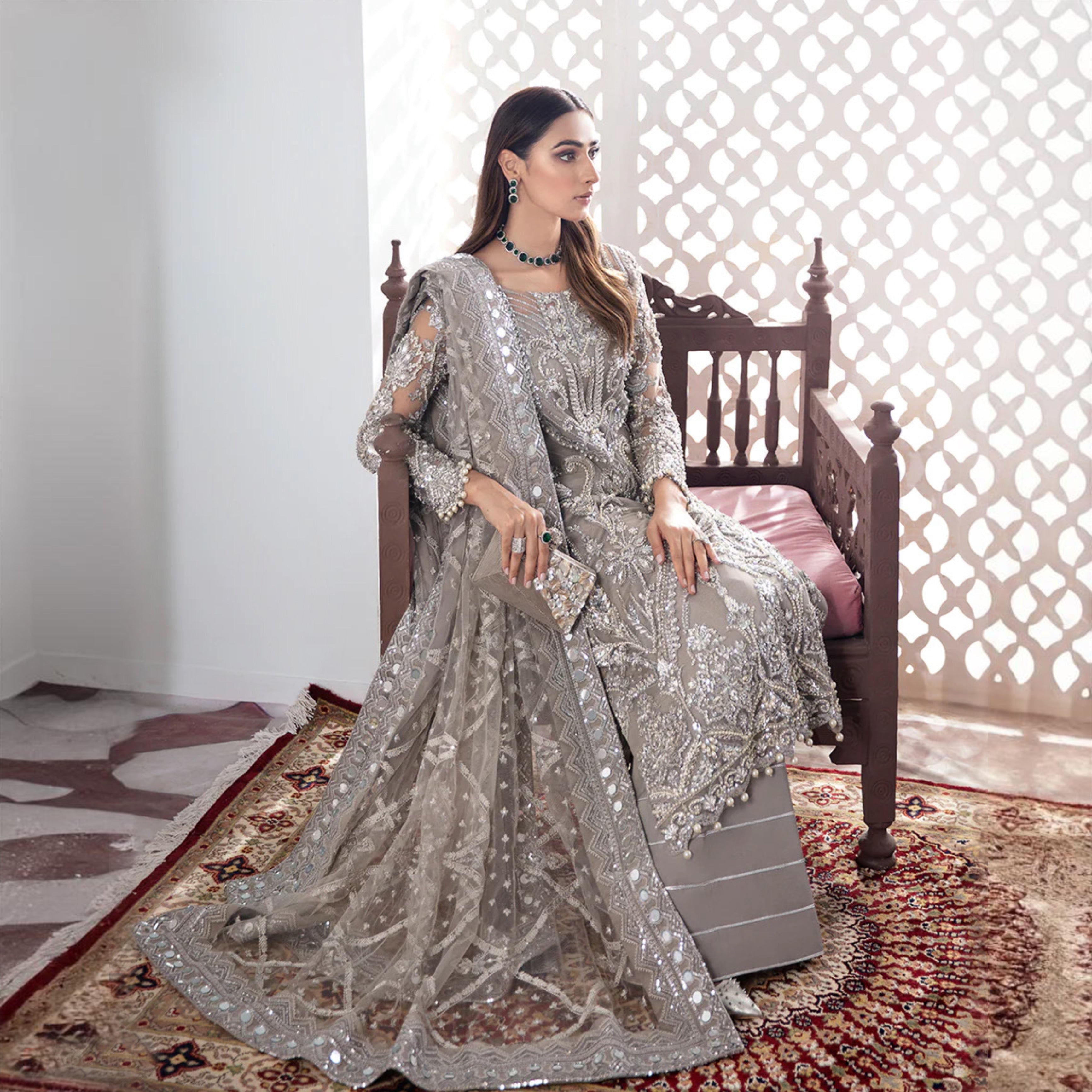 Gulnoor - is one of our favorite designs from our upcoming wedding formals collection - featuring a heavily adda worked and hand-embellished charcoal grey shirt, the design includes a stunning sheesha-embellished dupatta. The outfit comes along with a sleek sheesha-embellished belt to give it a classy look for any festive occasion.