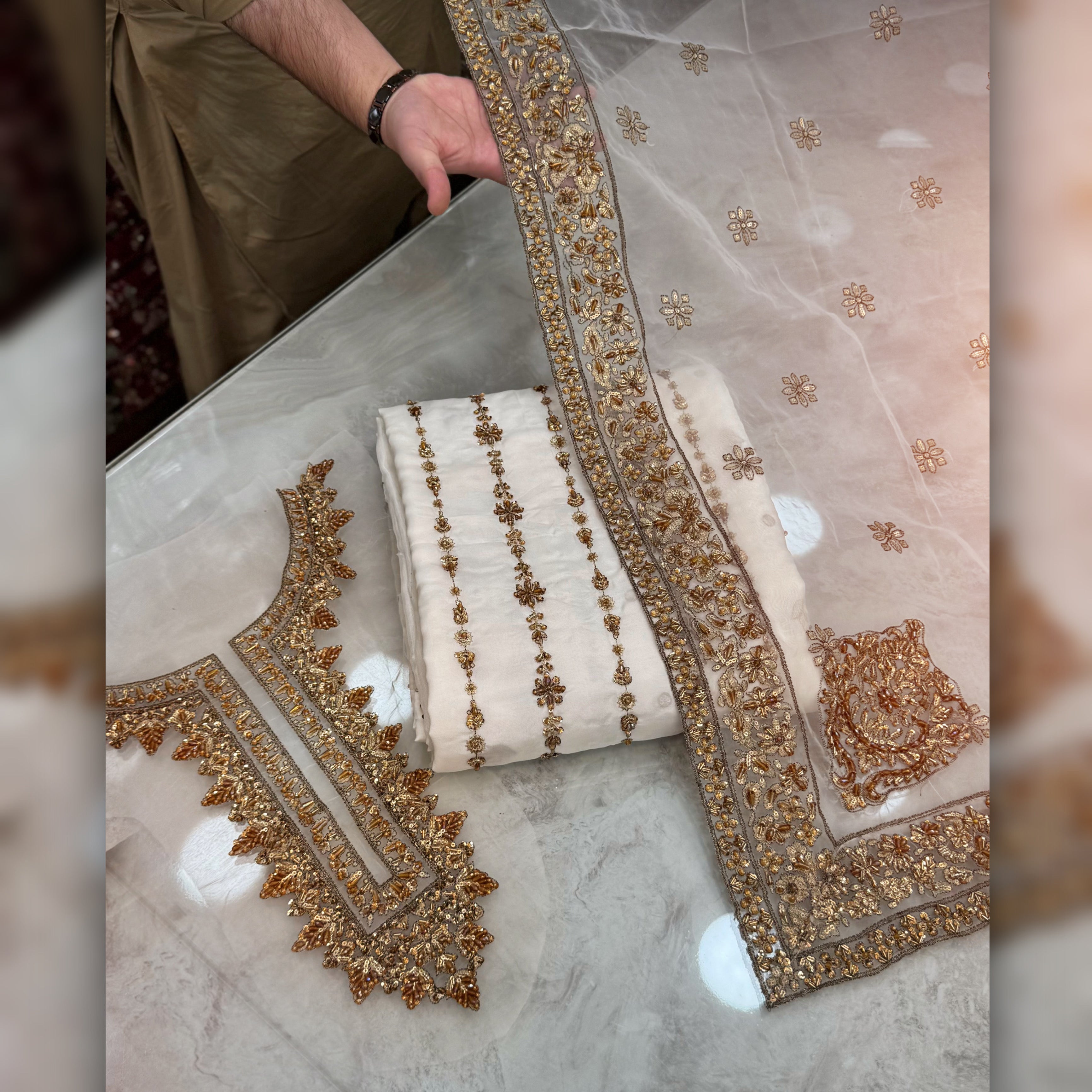 A timeless masterpiece of elegance, this designer suit is crafted in luxurious white tassel silk fabric. The long shirt exudes refined sophistication, adorned with exquisite golden hand-embellished detailing featuring cutdana, sequins, and delicate stonework. Paired with a ready-to-wear dupatta, beautifully finished with intricate handwork on all four sides, this ensemble strikes the perfect balance between grace and grandeur — an ideal choice for festive occasions and formal gatherings