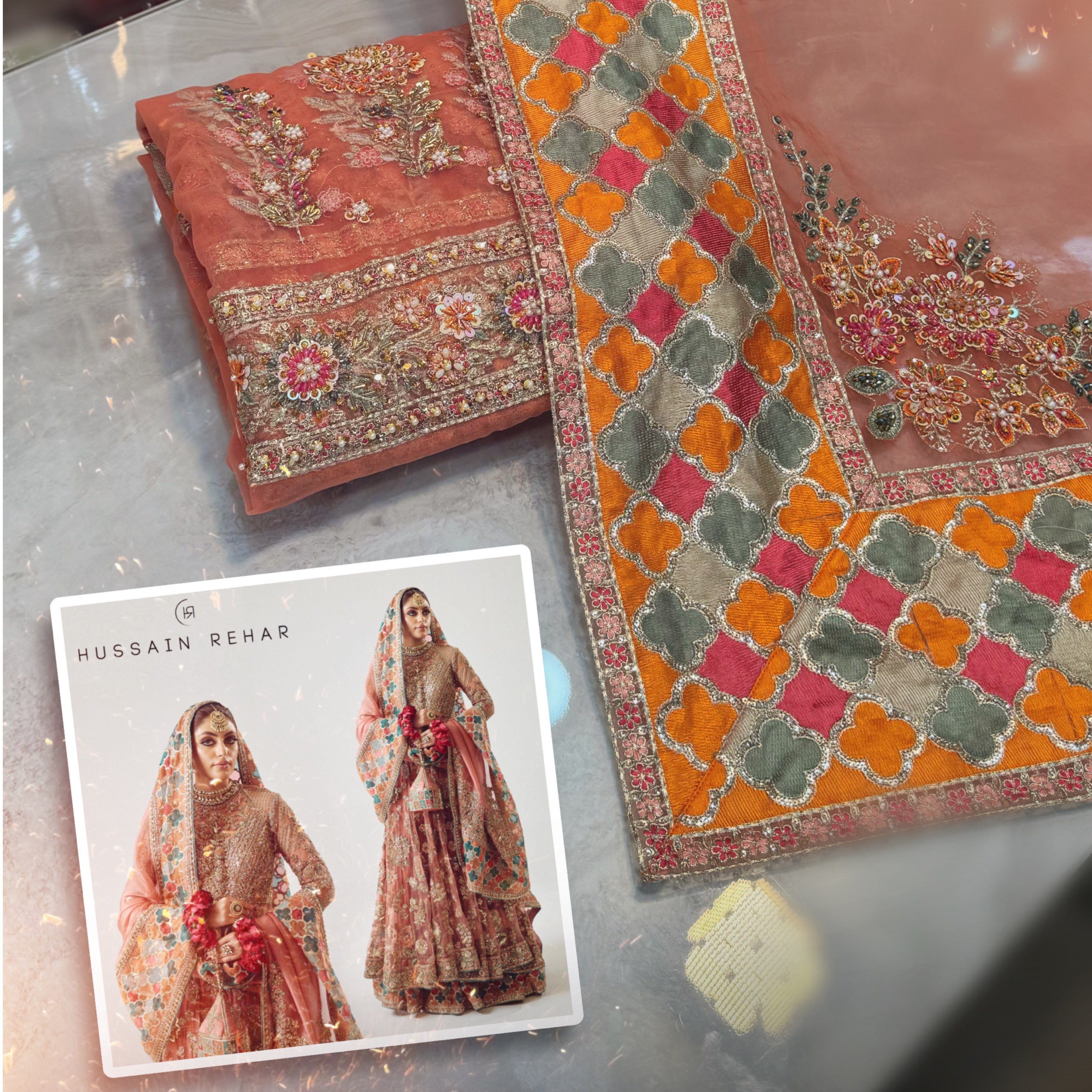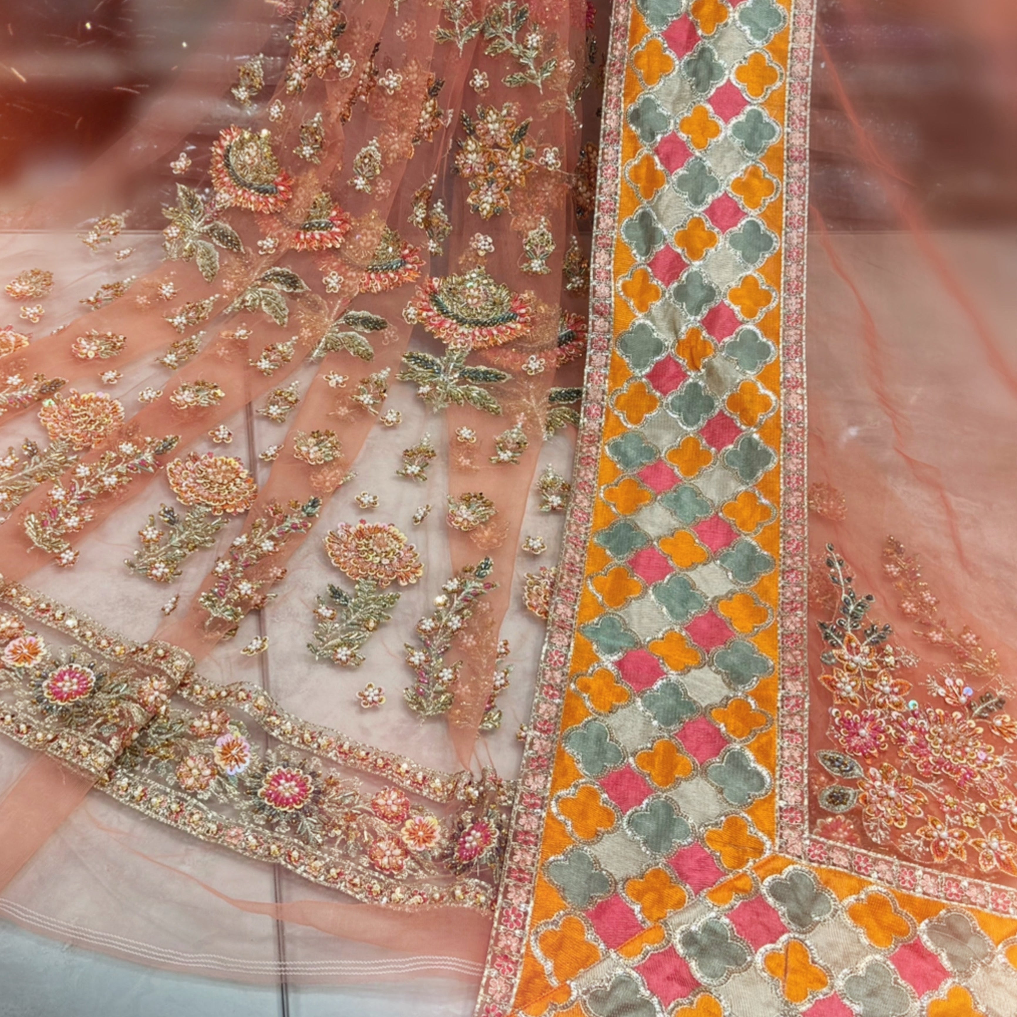 A spectacular rose gold net peshwas. The exquisite reham embroidery, enhanced with intricate adda work, elevates this ensemble to new heights of elegance. The medium silk crushed sharara, adorned with organza chatapati borders, exudes a sense of regal sophistication. And the organza dupatta, adorned with mesmerizing adda work, and organza chatapatti four sided borders adding a touch of ethereal beauty.