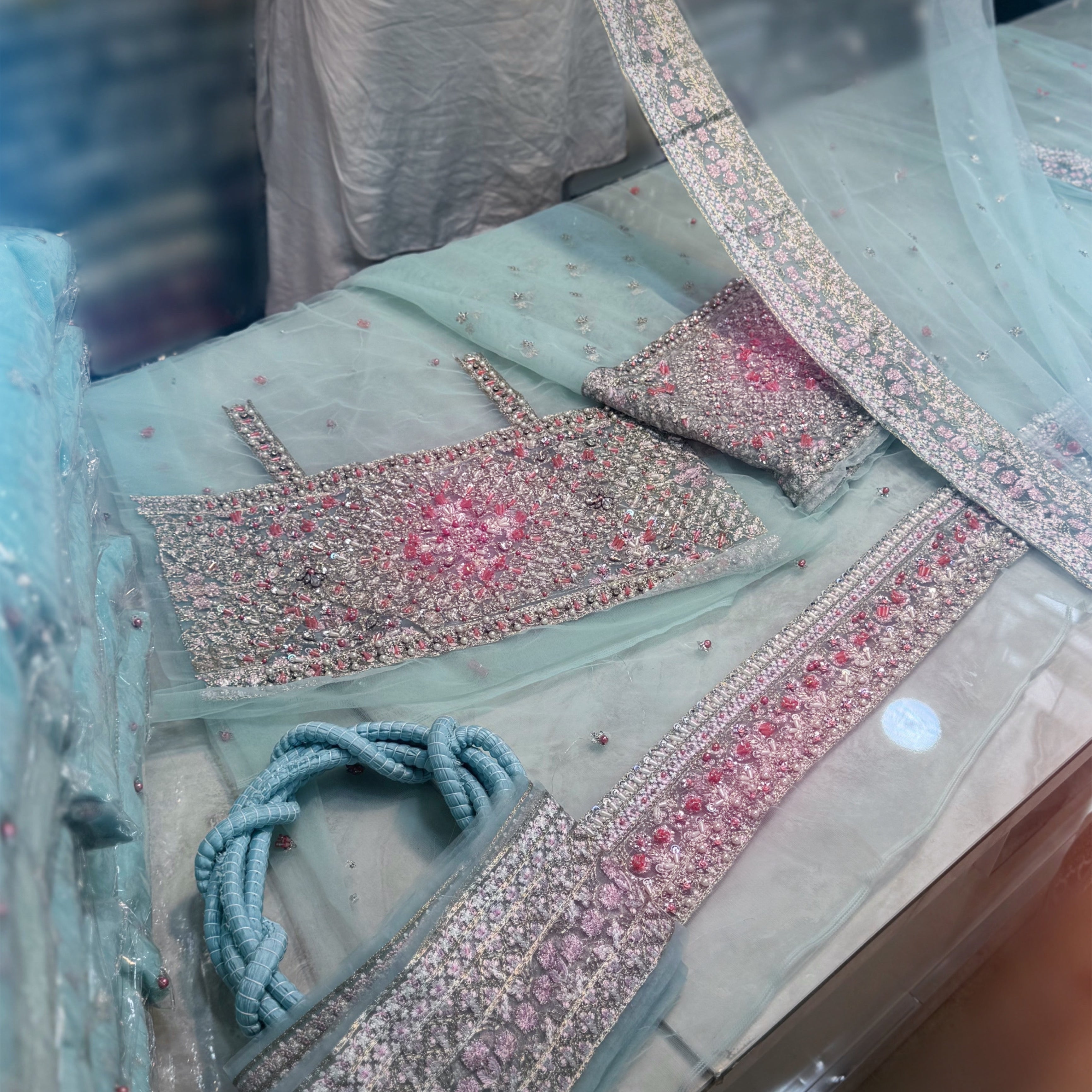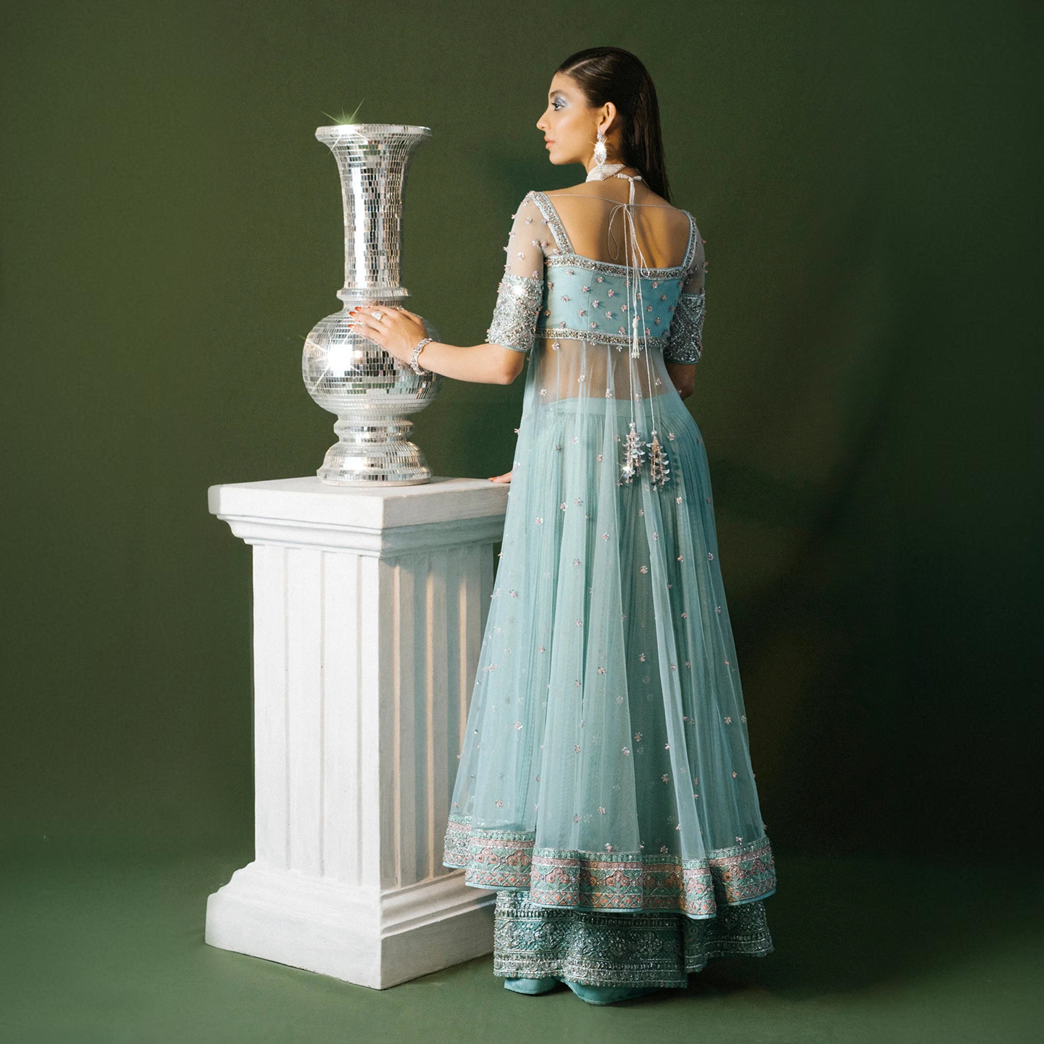 Wrapped Beautifully In This Elegant Silhouette ‘Sahil’, A Contem- porary Dress Of Periwinkle Blue Tone Crafted To Perfection On Net Fabric Base. It Is Filled With 3d Embellishments, Pearls, Crystals And Modern Embroideries. To Complete The Look It Is Paired With Embroidered Dupatta With Baby Lilac Accents, Rawsilk Flared Lehnga And Undershirt, Giving It A Splendid Formal Occasion Look.