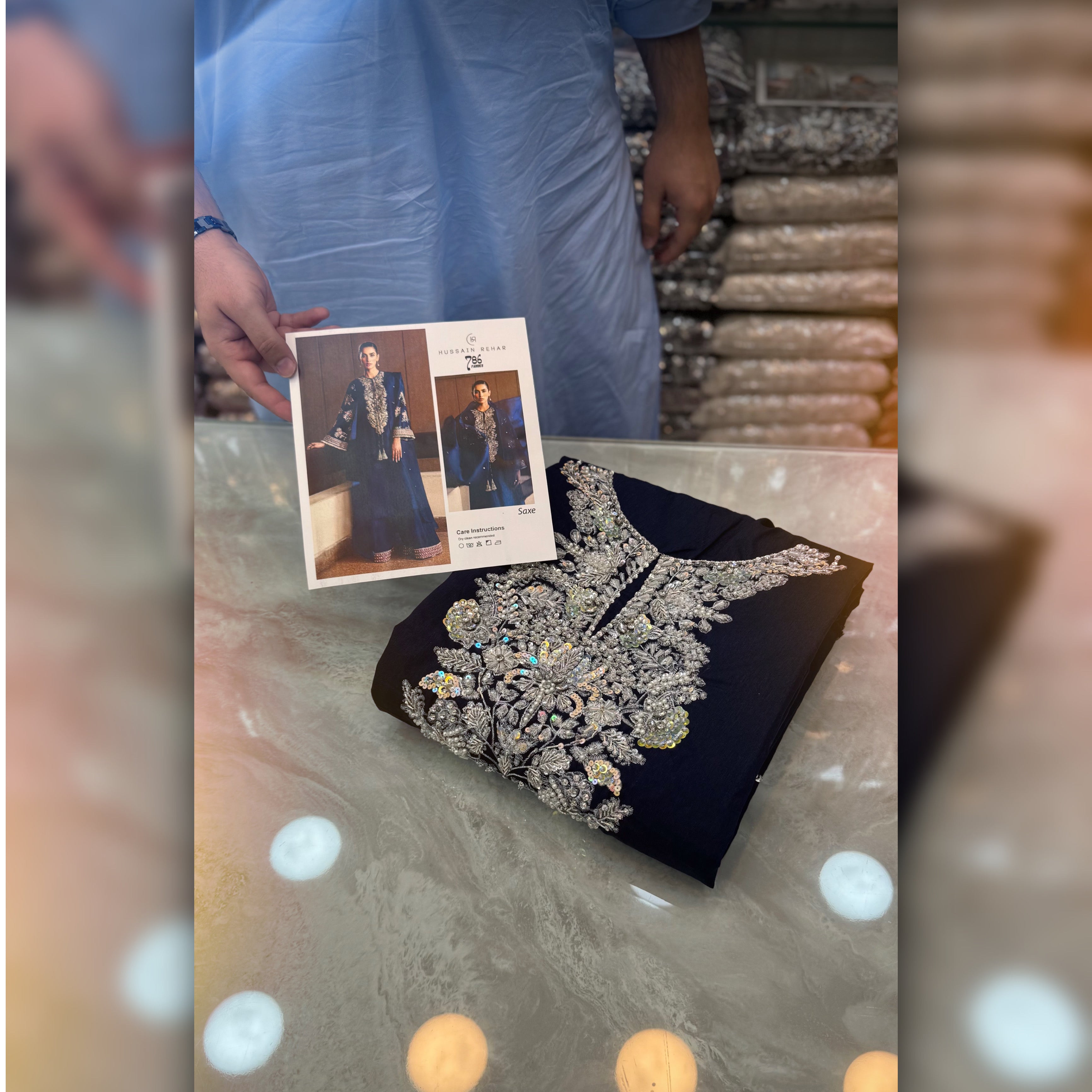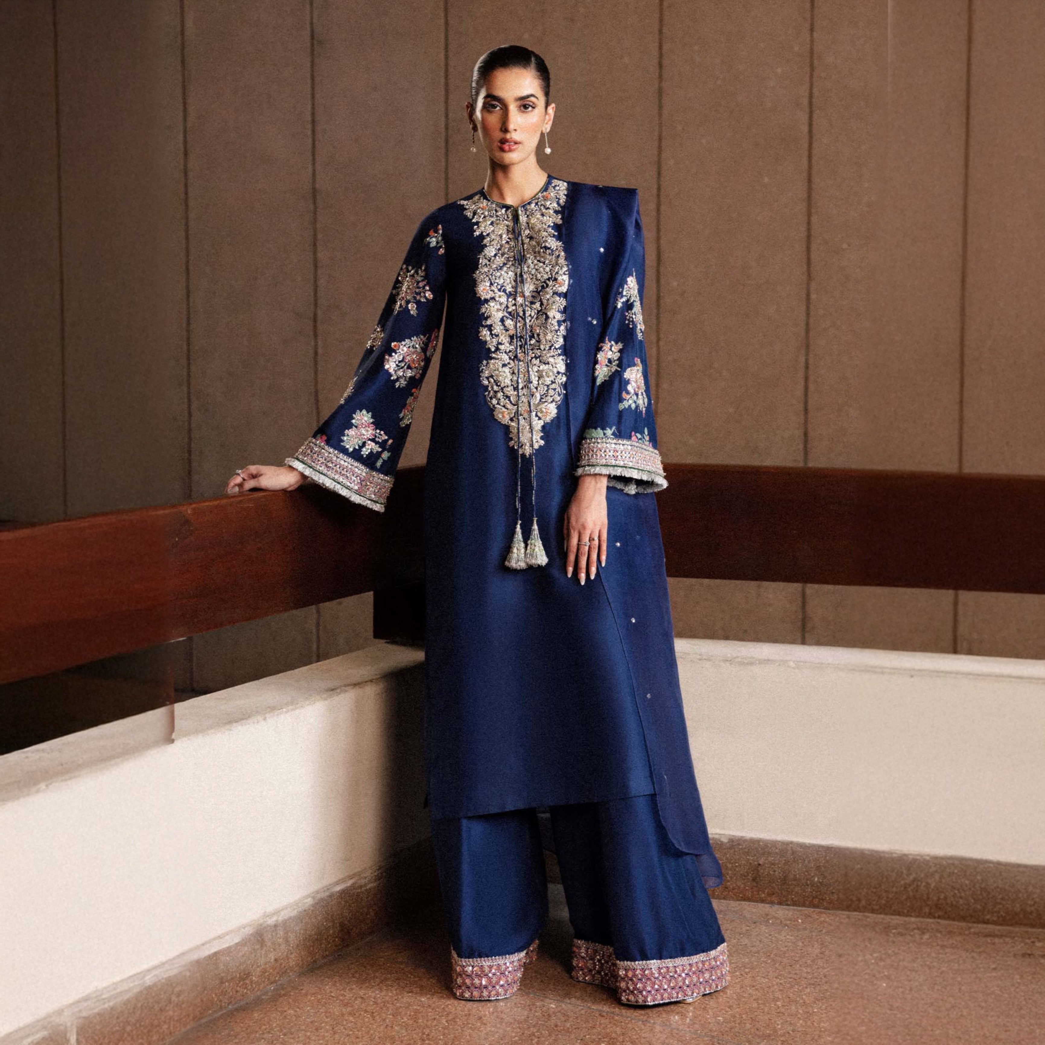 This classic navy blue raw silk long shirt has embellishment details of silver nakshi, sequins, gota, mukesh, orange, ice blue and green cut dana on neckline. The sleeves are heavily embellished with pink , orange and green sequins, cut dana and silver kiran at the hem. Its paired with red raw silk palazzo pants with borders embroidered and embellished with silver sequins, naqshi, buggle beads and pipes. The outfit contains 2.75 yards organza dupatta with sequin spray all over.