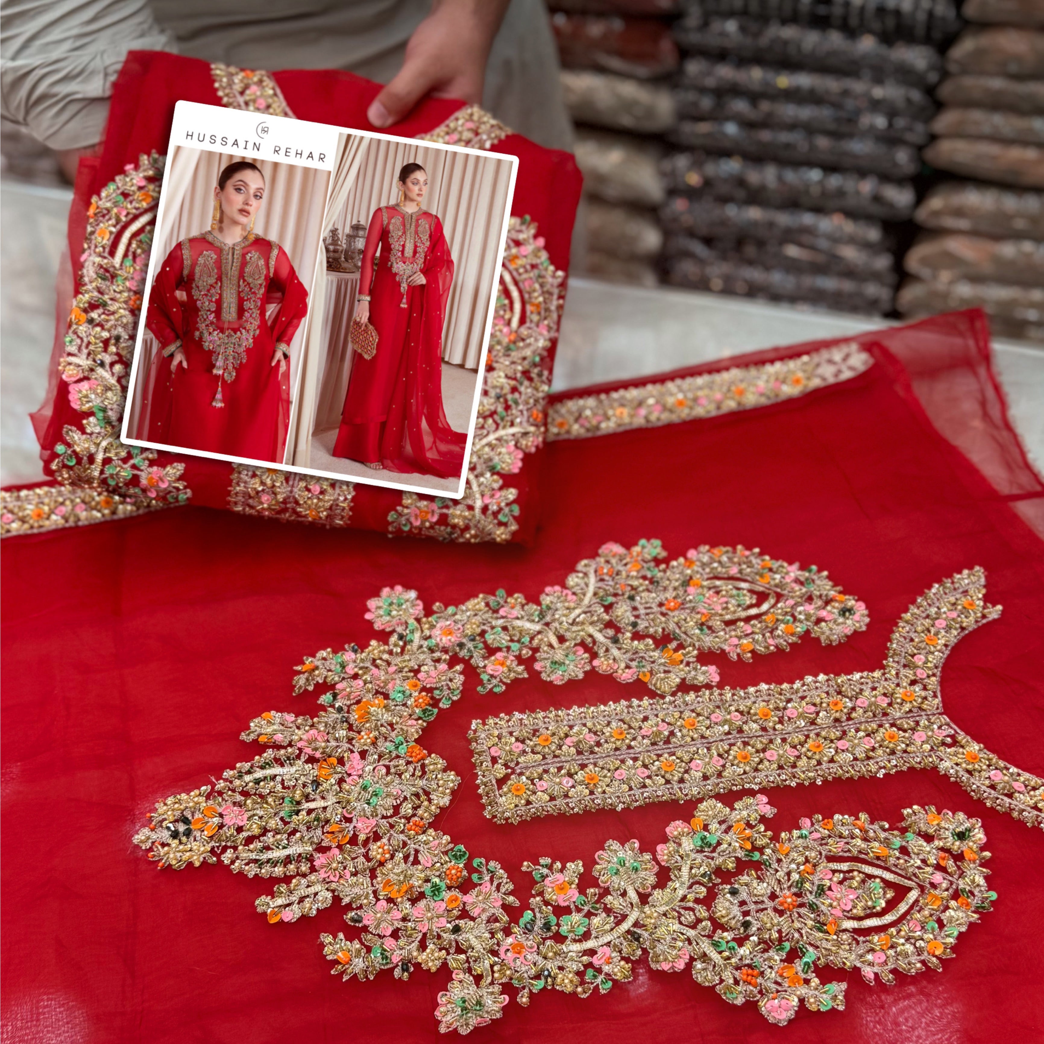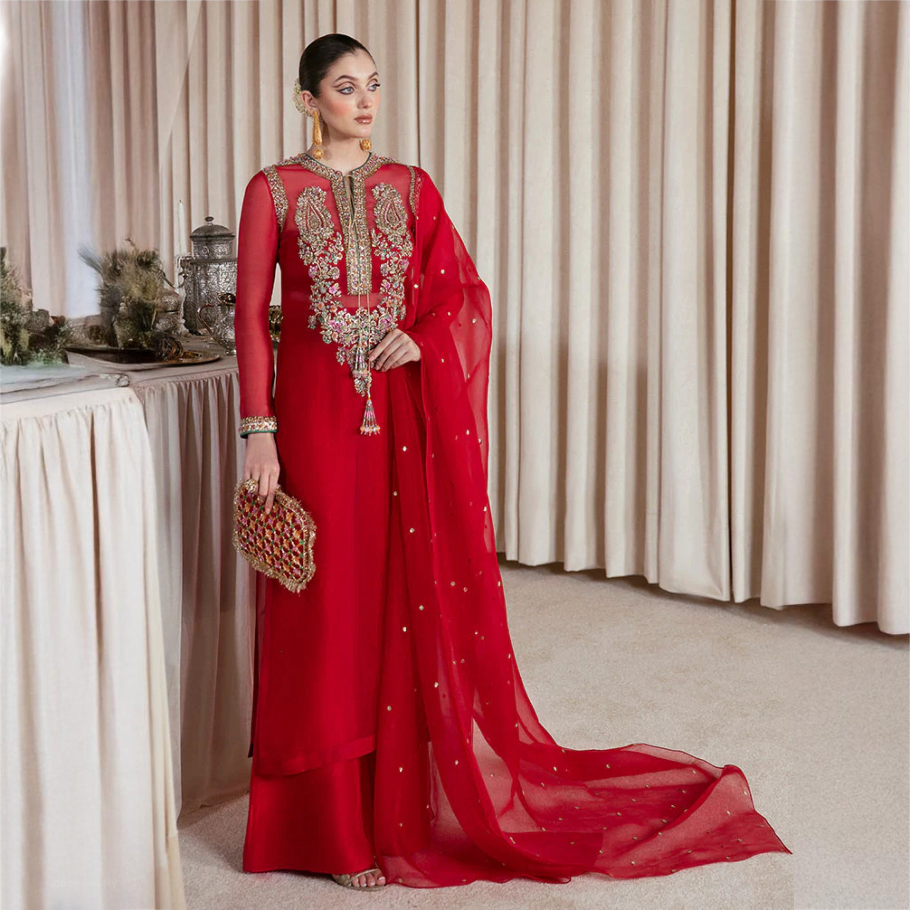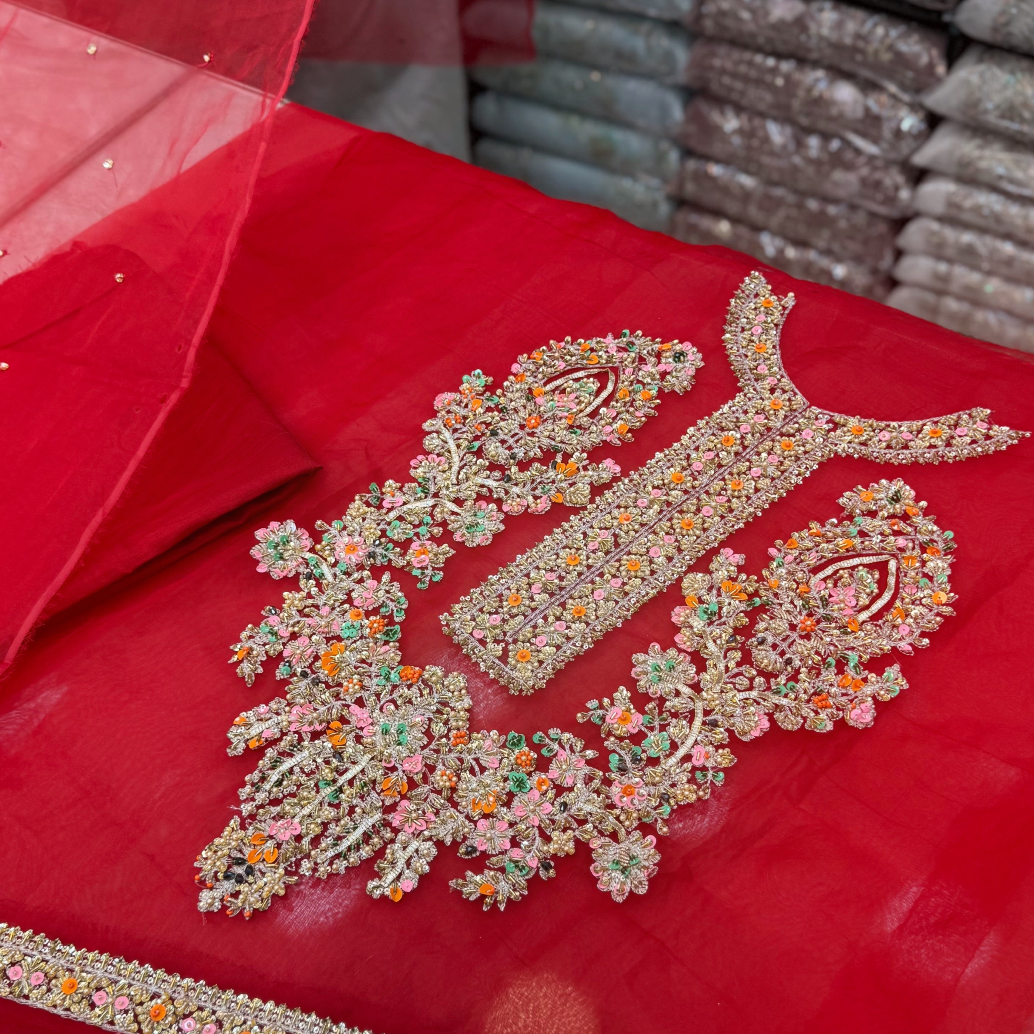 An absolutely regal red organza shirt with embellishments in the front of nakshi, dabka, sitara, and cutdana in multicolor. It comes with a Rawslik trouser. The outfit consists of an organza dupatta with dequin chatta on it.