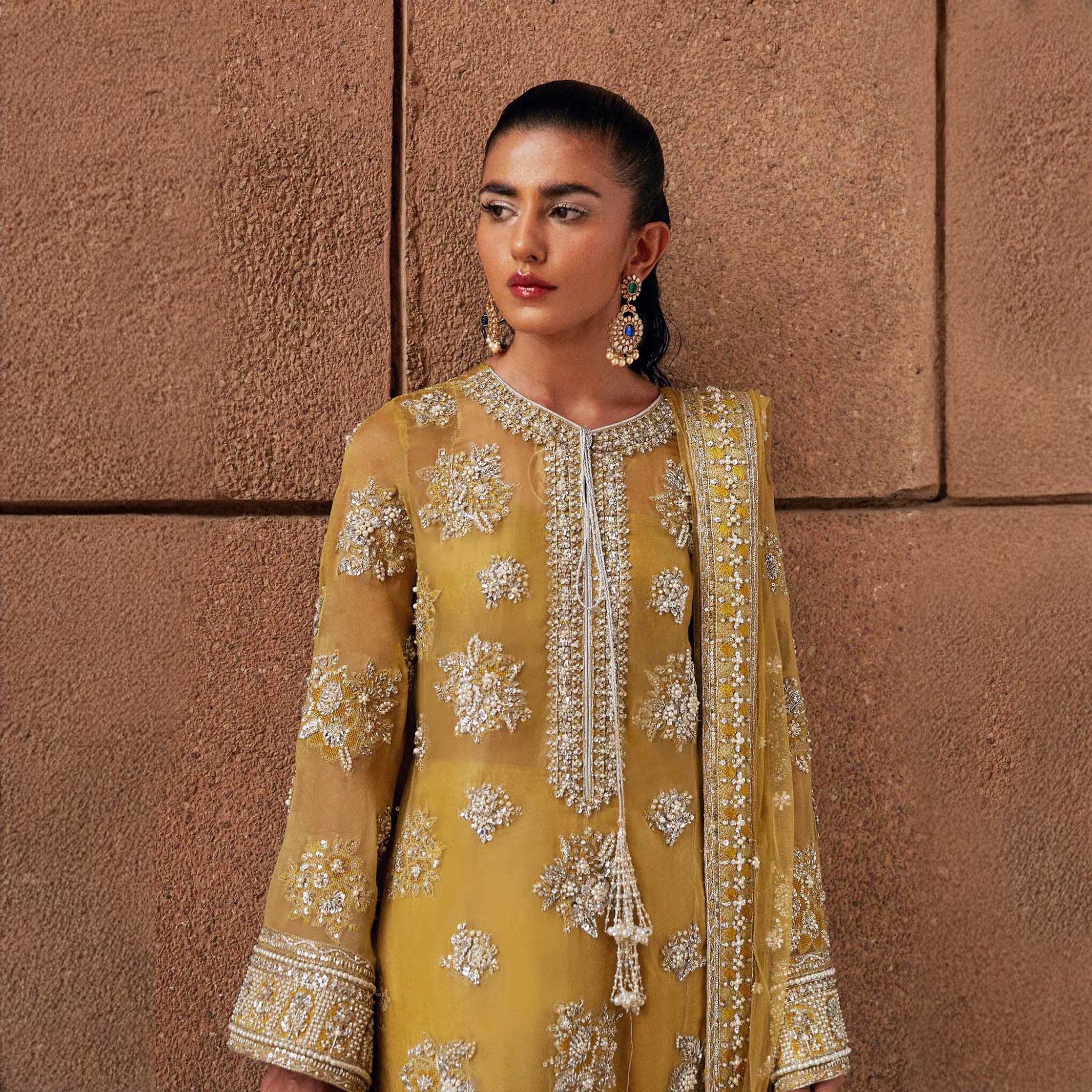 This silhouette brings a modern charm to your wardrobes with its pastel lime yellow color, composed with cross stich floral motifs all over and with distinctive daman borders. Further it features velvet palazzo with color block embellished border and with net dupatta composed with pearl spray and with heavy embellished four side borders.
