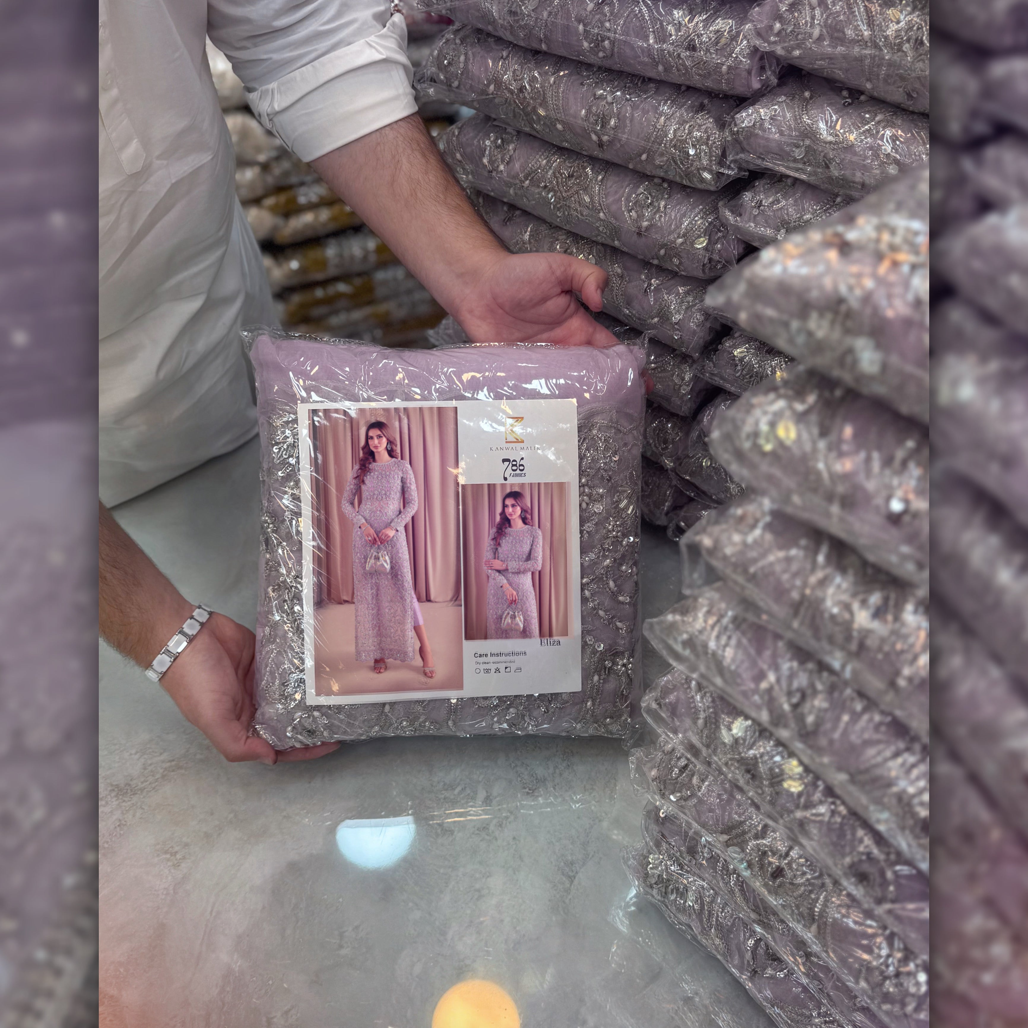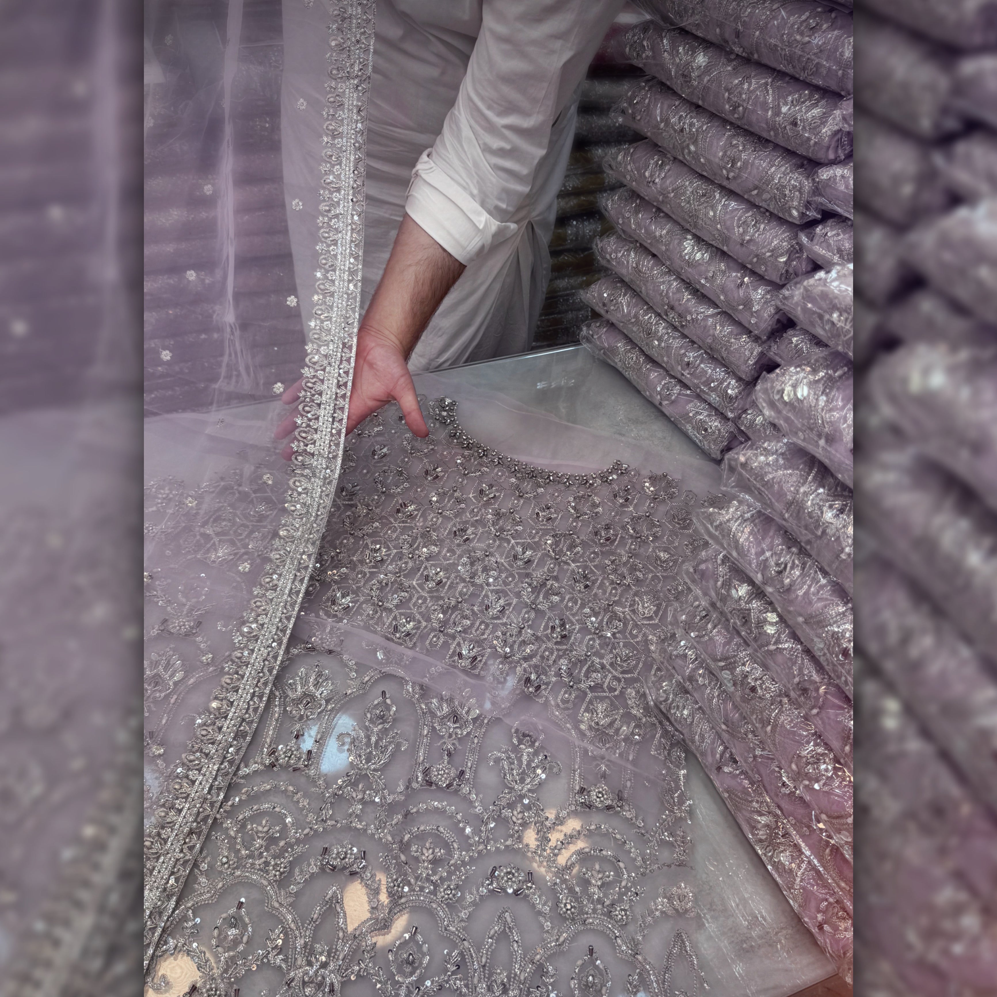 Step into the spotlight in our mesmerizing lilac long dress, adorned with magnificent silver embellishments that promise to dazzle and enthrall. Meticulously crafted from luxurious organza fabric, this ensemble seamlessly blends timeless charm with modern allure. The dress cascades gracefully, enveloping you in a regal aura that commands attention, while its form-fitting bodice accentuates your curves. Delicate embroidery, shimmering sequins, and elaborate embellishments add opulence and sparkle, elevating your style to new heights. Completing this show-stopping look are cigarette pants in the same captivating lilac hue, adorned with silver tissue side seams for a striking finish. Get ready to captivate hearts and steal the spotlight with this exquisite ensemble.