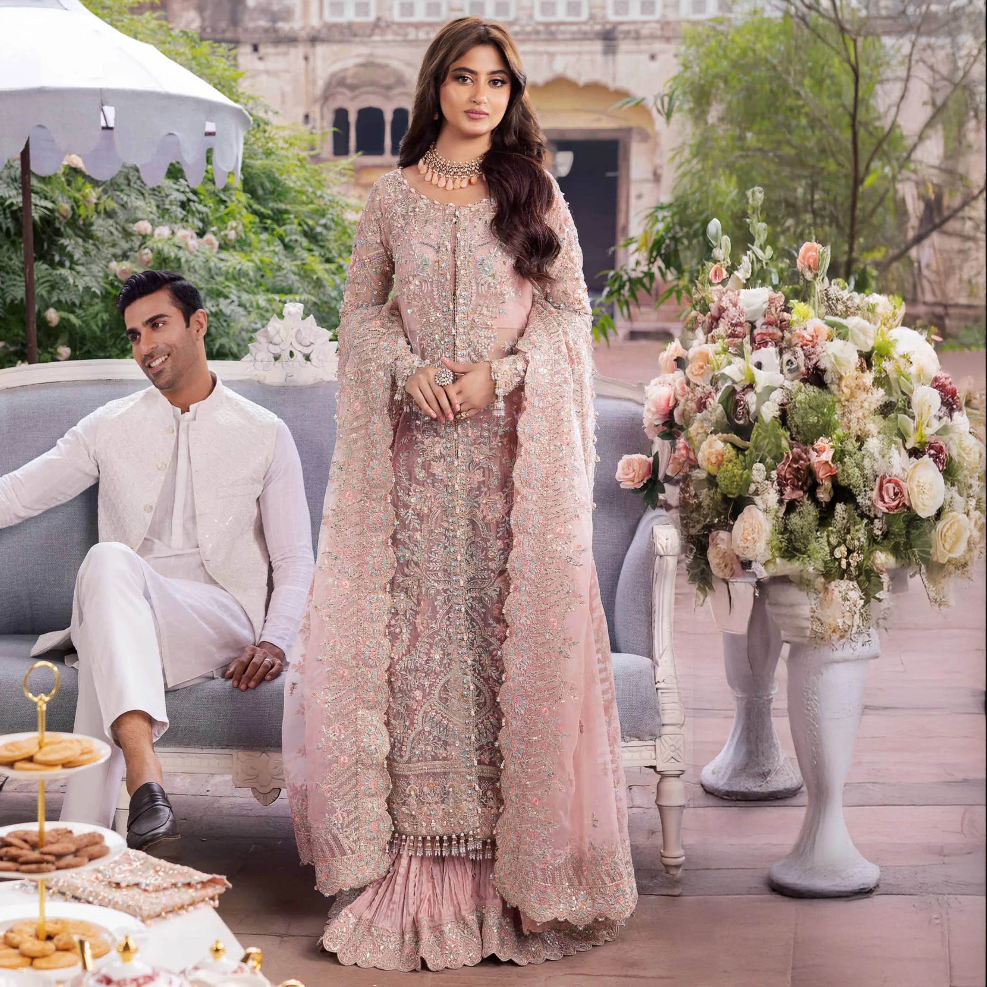 Lina , the ethereal outfit is a lovely day and night formal wear. Lara portrays a long organza shirt, with two front slits, and sparkling crystal ornamentation on a shimmery lilac canvas. This pleasing pattern makes this outfit outstanding while paired with dupatta and pearl details on the hem.
