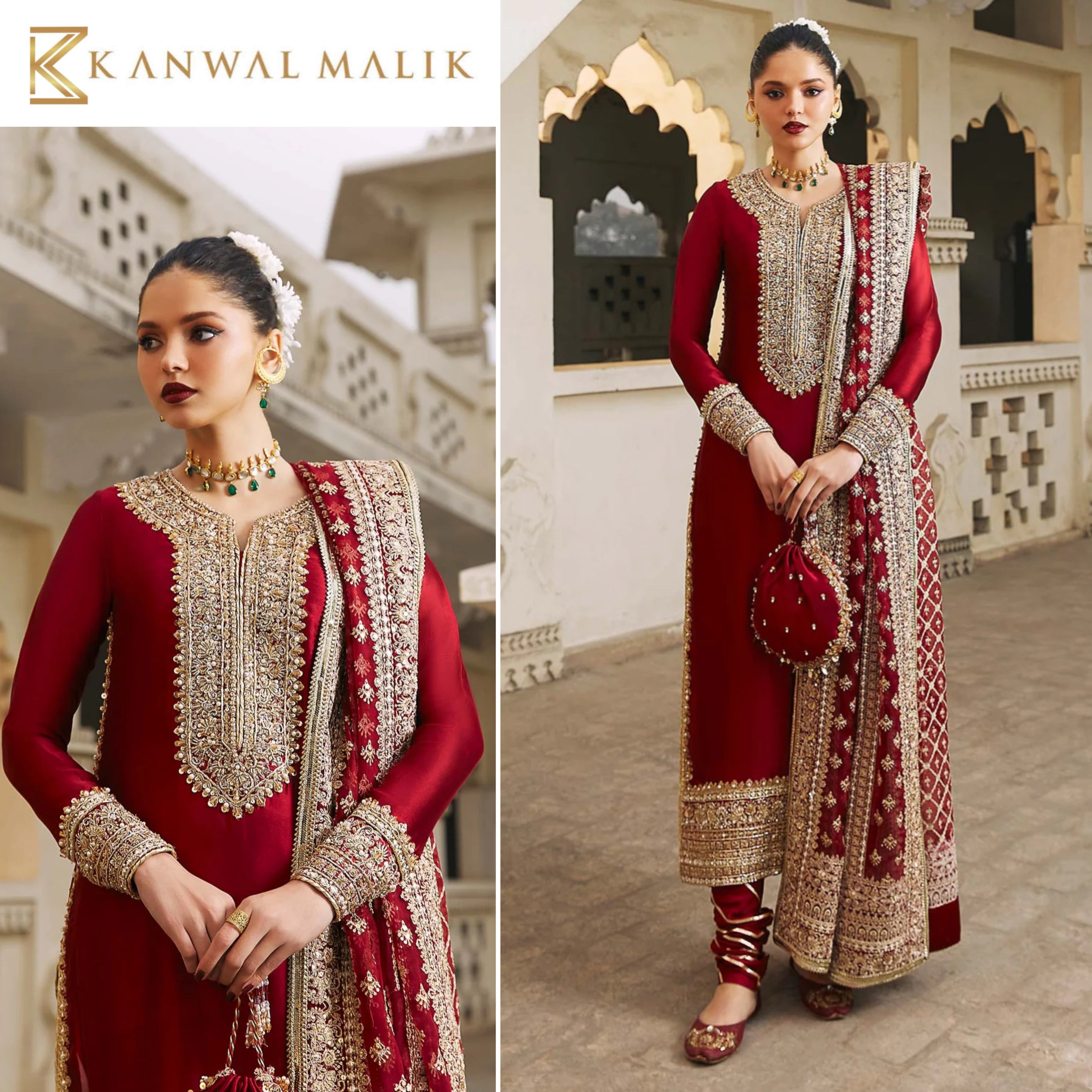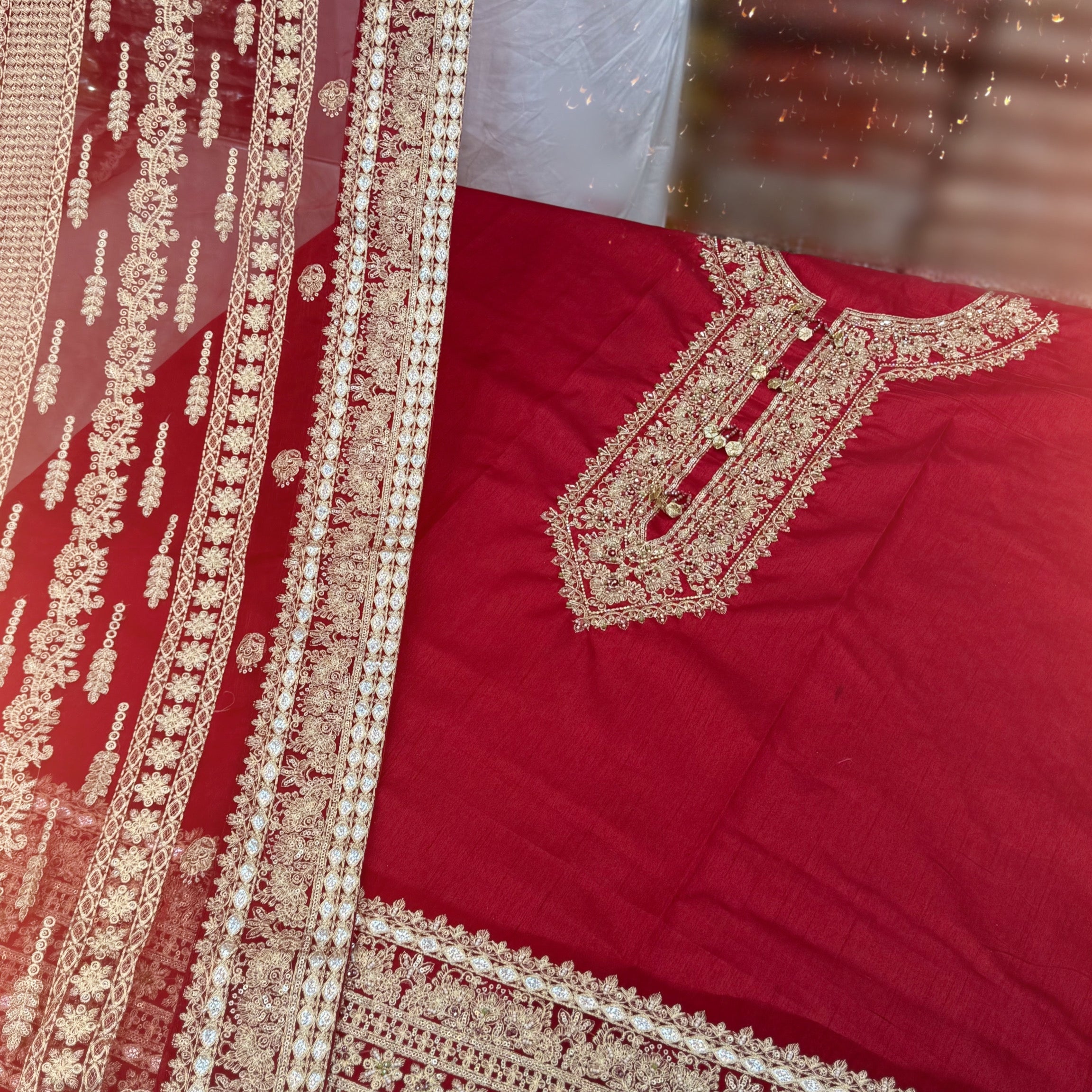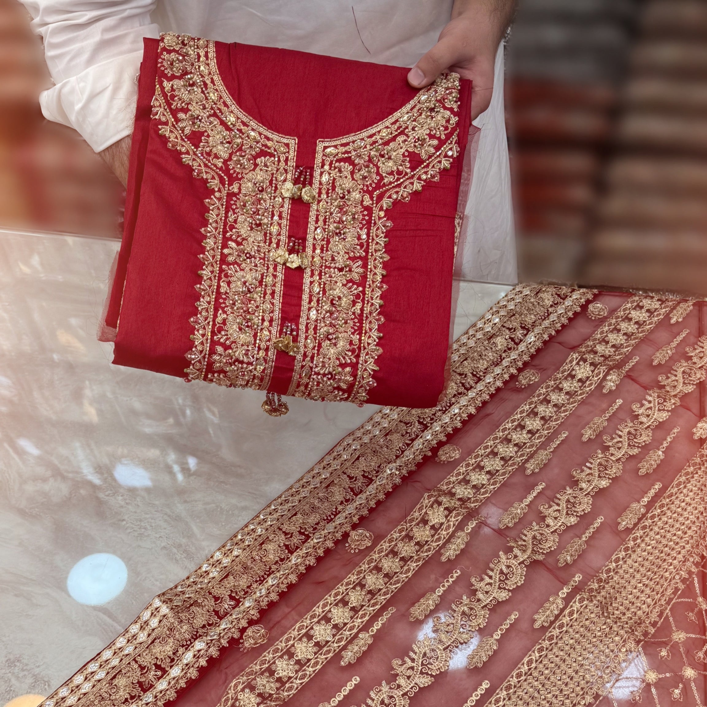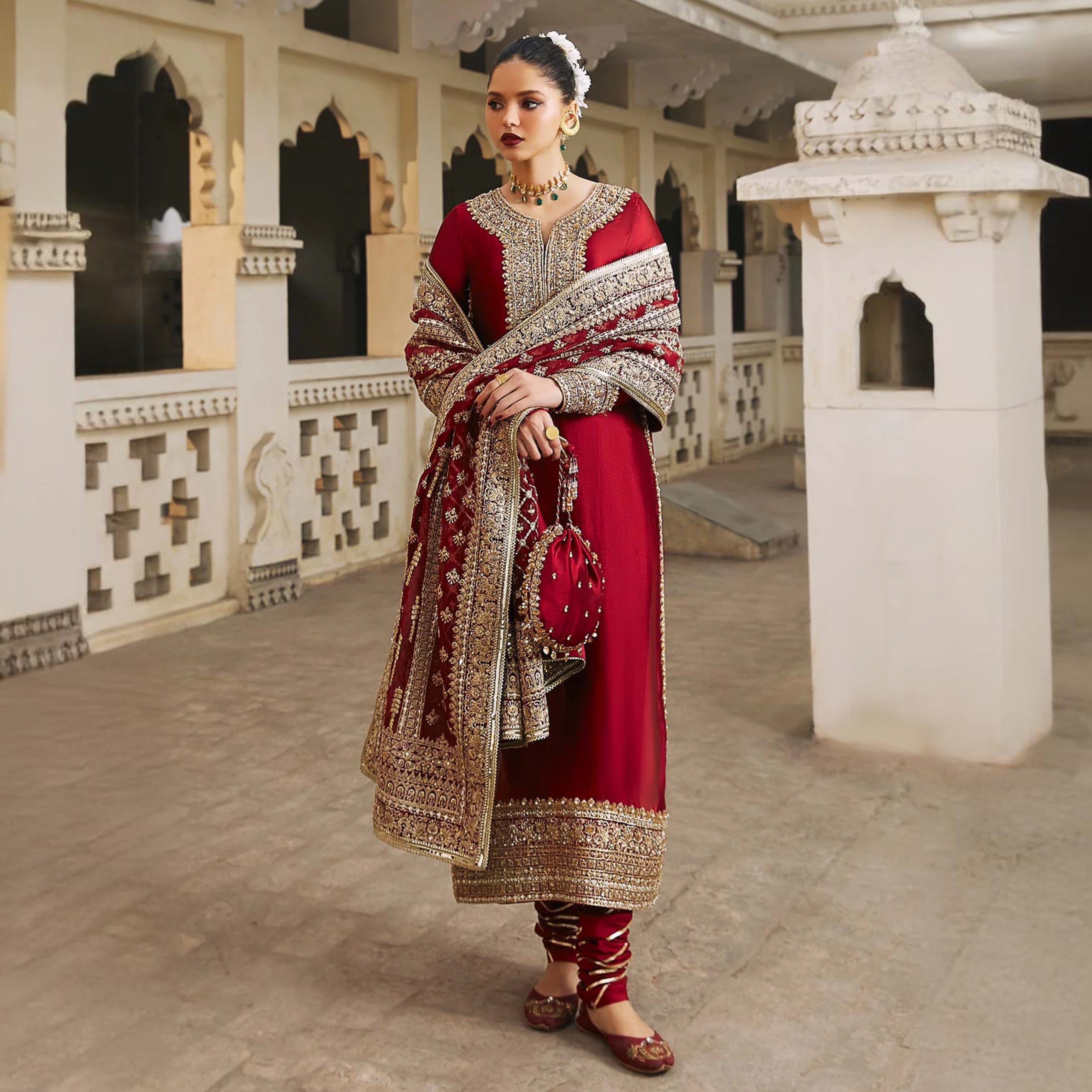 Indulge in the epitome of elegance with our exquisite long tissue silk shirt in a luxurious rich deep red tone. This opulent attire is a testament to timeless beauty, featuring intricate embroidered borders and a neckline that adds an extra layer of sophistication to its design. The meticulous craftsmanship is evident in the fine embellishments adorning the entire border of the shirt, creating a stunning visual feast. To elevate the ensemble further, the outfit is accompanied by a fully embroidered dupatta, adding a touch of glamour and completing the ensemble with finesse.