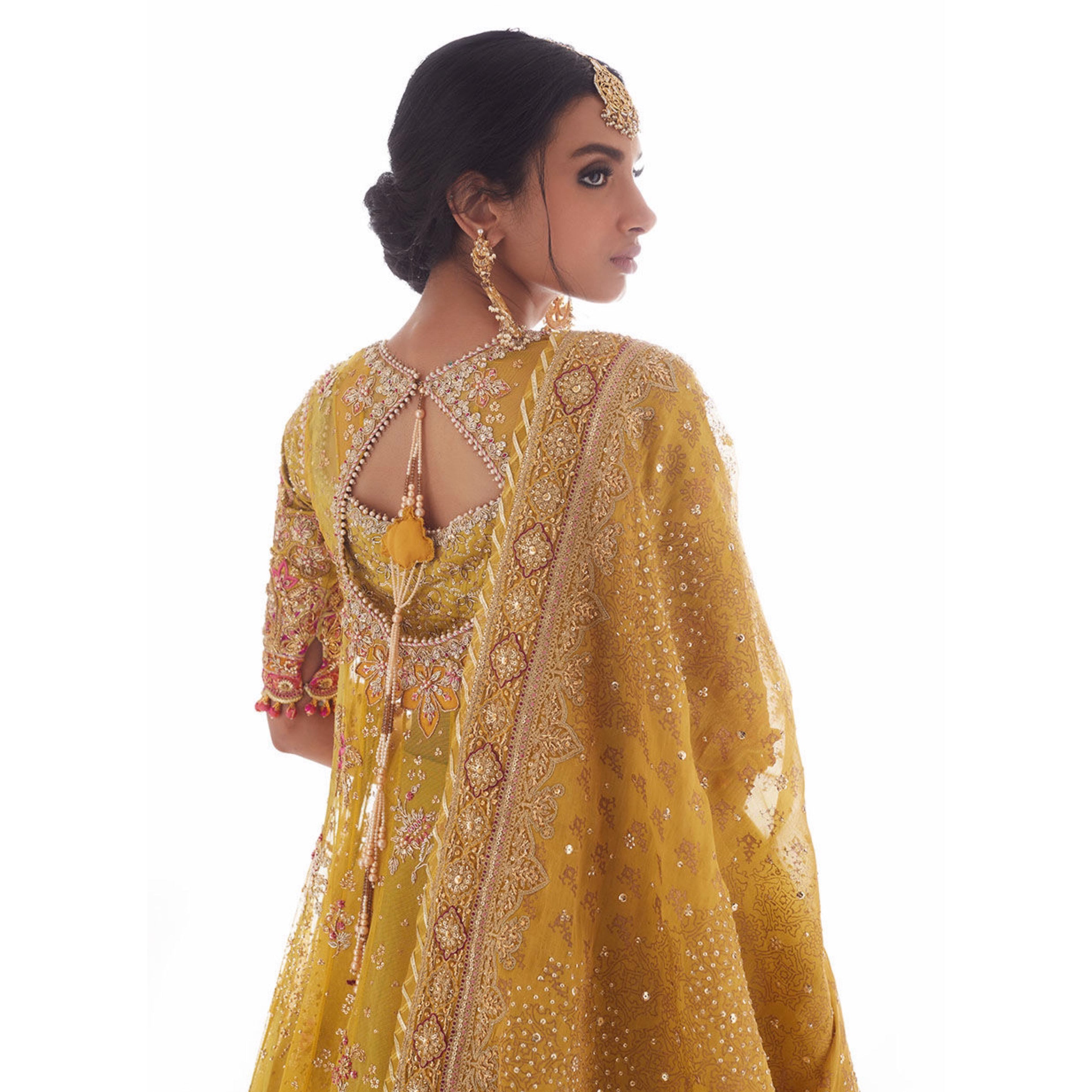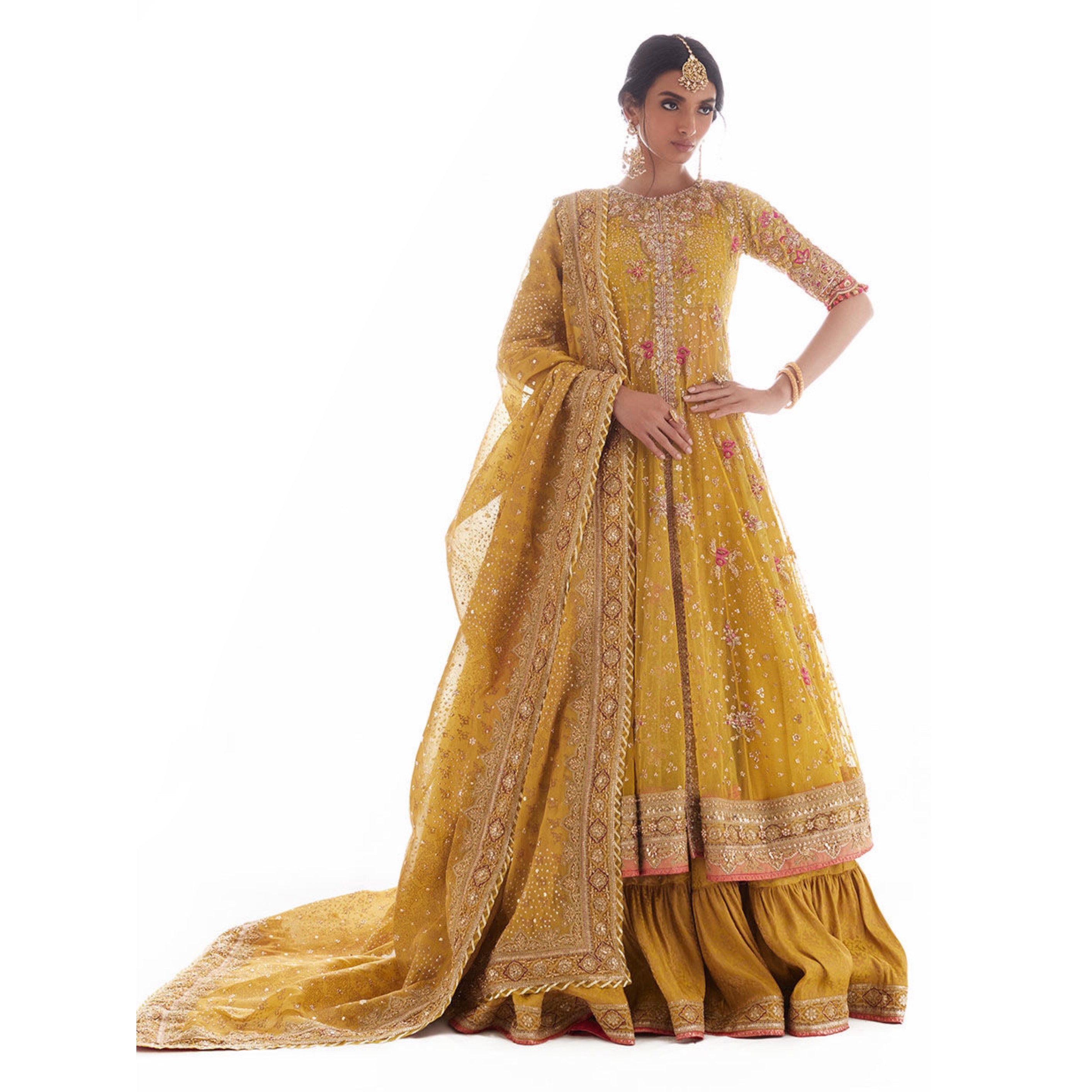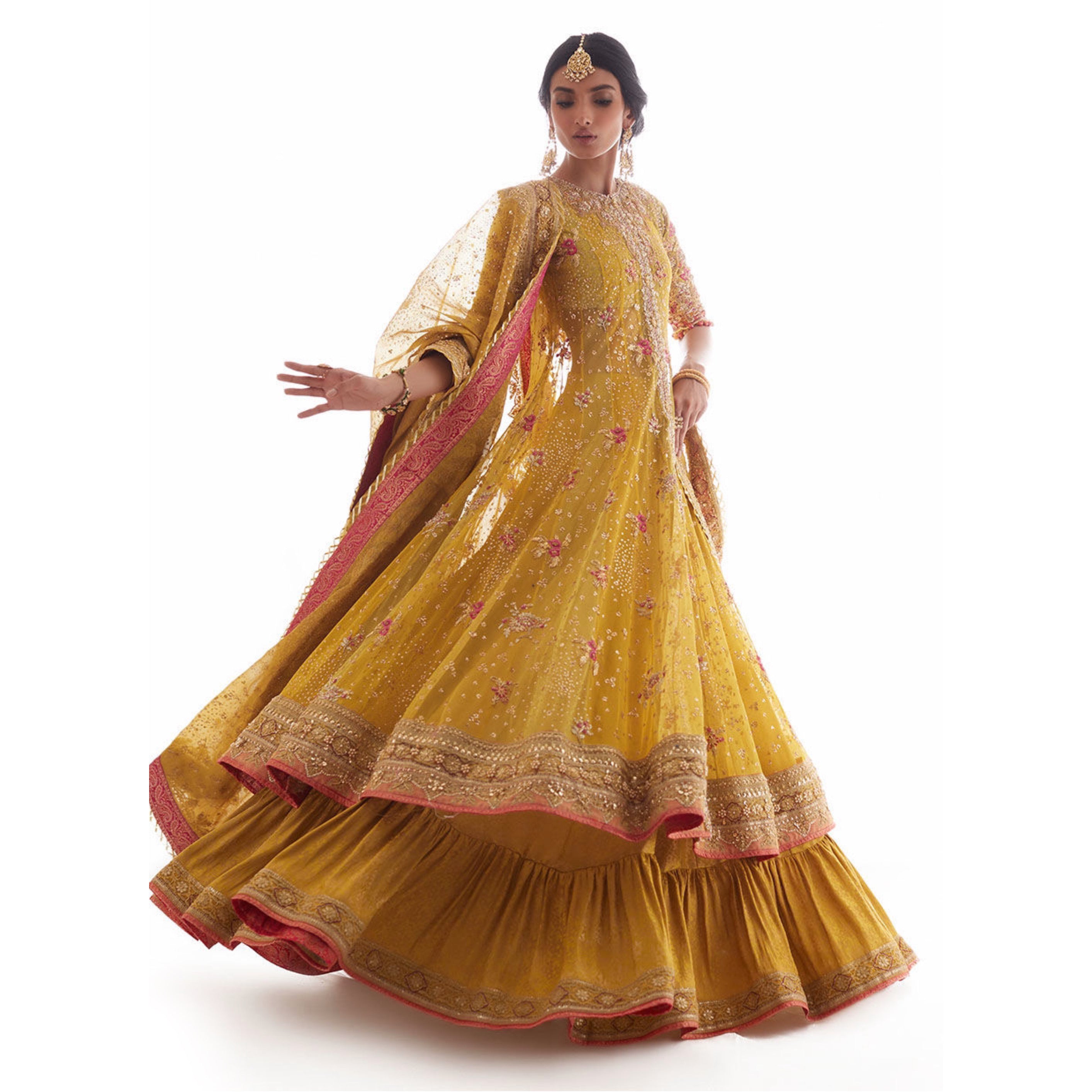 Introducing our stunning ensemble, featuring a Net Kalidar, a Golden Tissue Dupatta, and a Jamawar Lehenga. This ensemble is designed to make you feel like royalty, exuding elegance, and grace. The net Kalidar adds a touch of ethereal beauty with its flowing silhouette. The intricate work of sitara, tilla, resham, mukaish, and gotta enhances the overall design, creating a mesmerizing and luxurious look. Wear this ensemble to weddings, special occasions, or any celebration where you want to make a statement. The blend of net, tissue, and jamawar fabrics, along with the meticulous embellishments, makes this ensemble a true work of art. Embrace the opulence and allure of this stunning set and leave a lasting impression wherever you go.
