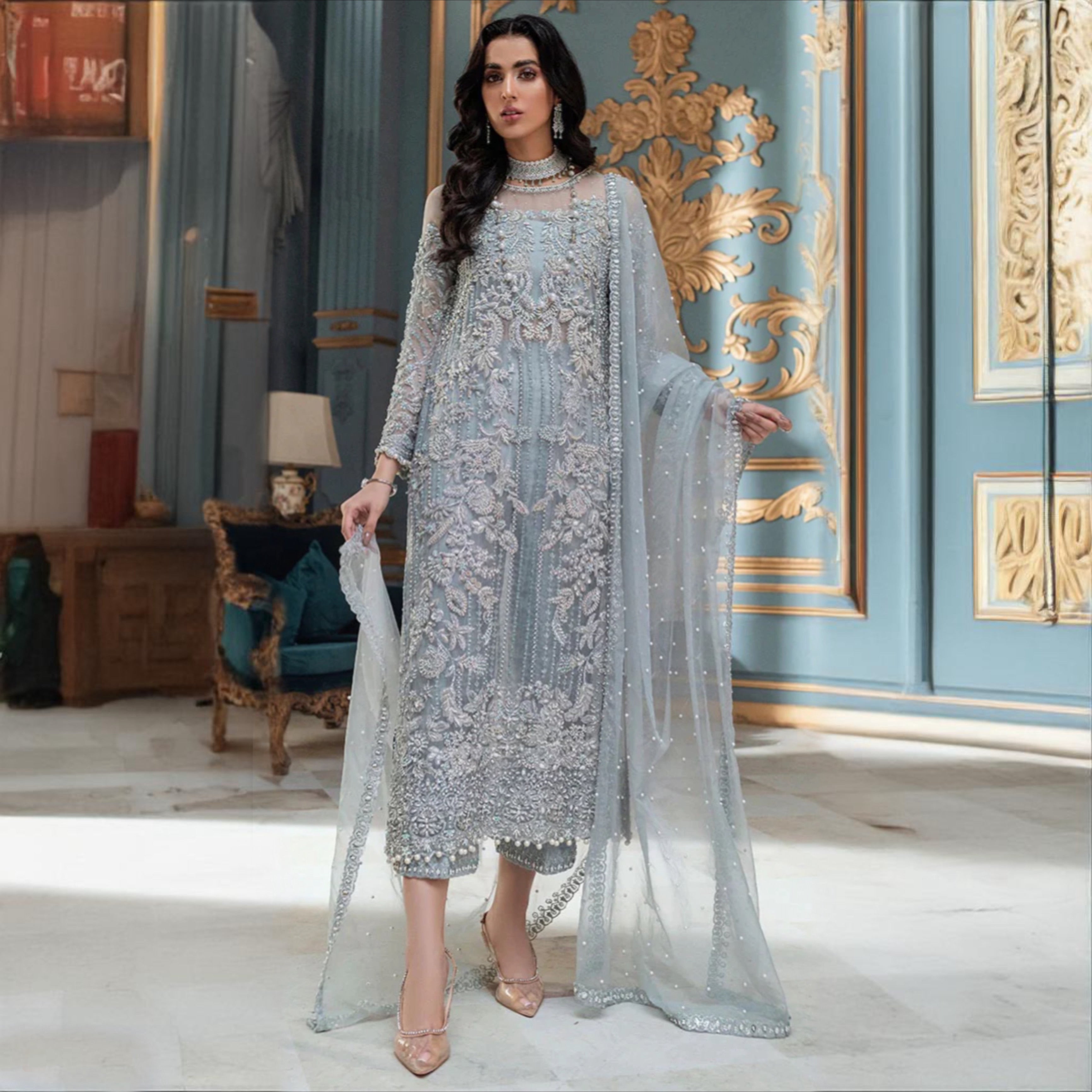 This ice blue long shirt crafted from pure silk organza is heavily ornamented with Crystal's and thread work. This luxurious outfit is finished with raw silk pants and a pearl embellished dupata for an ethereal look