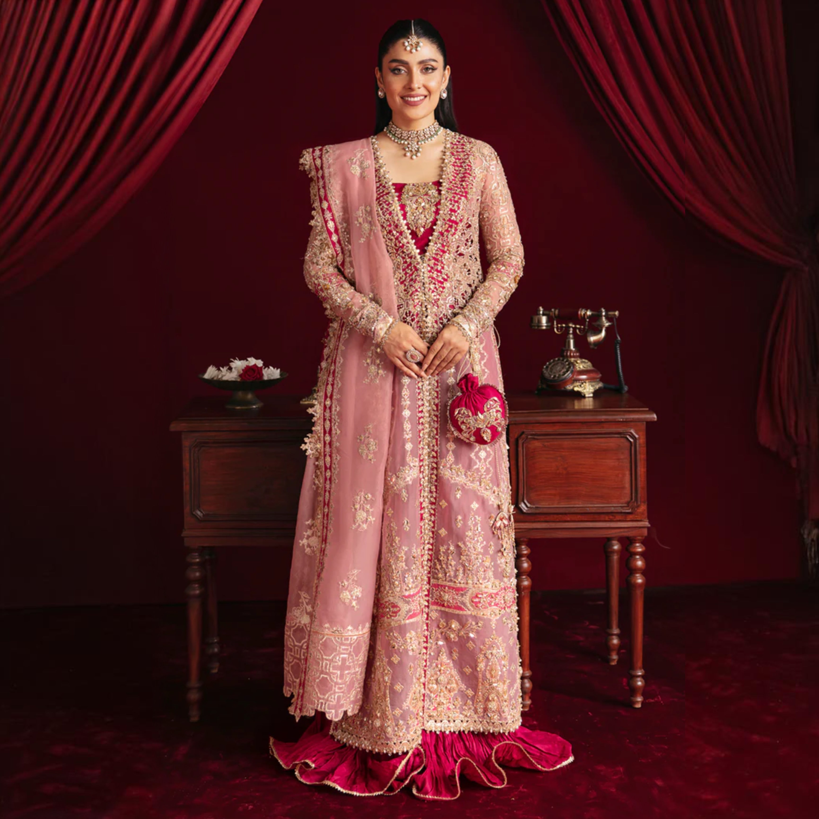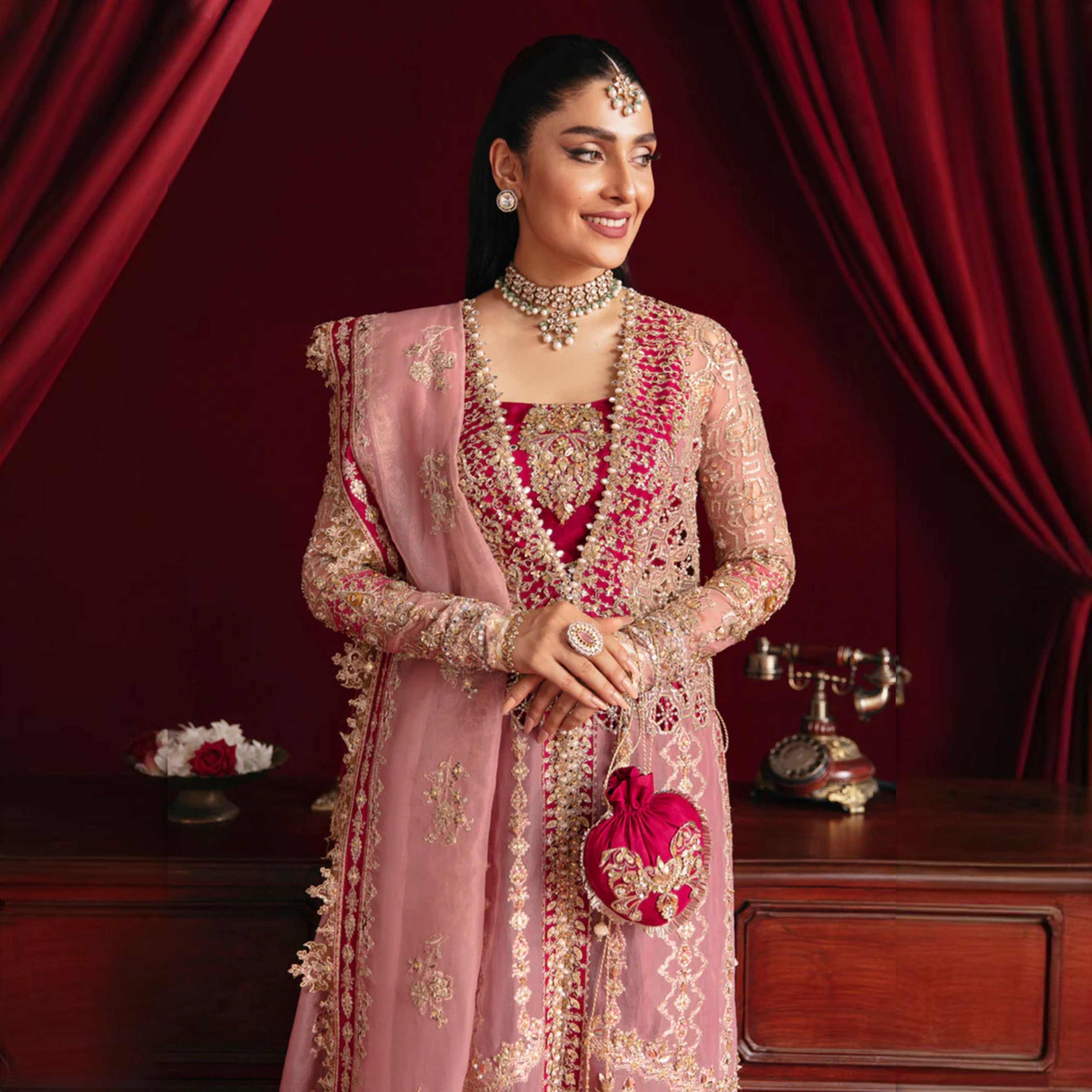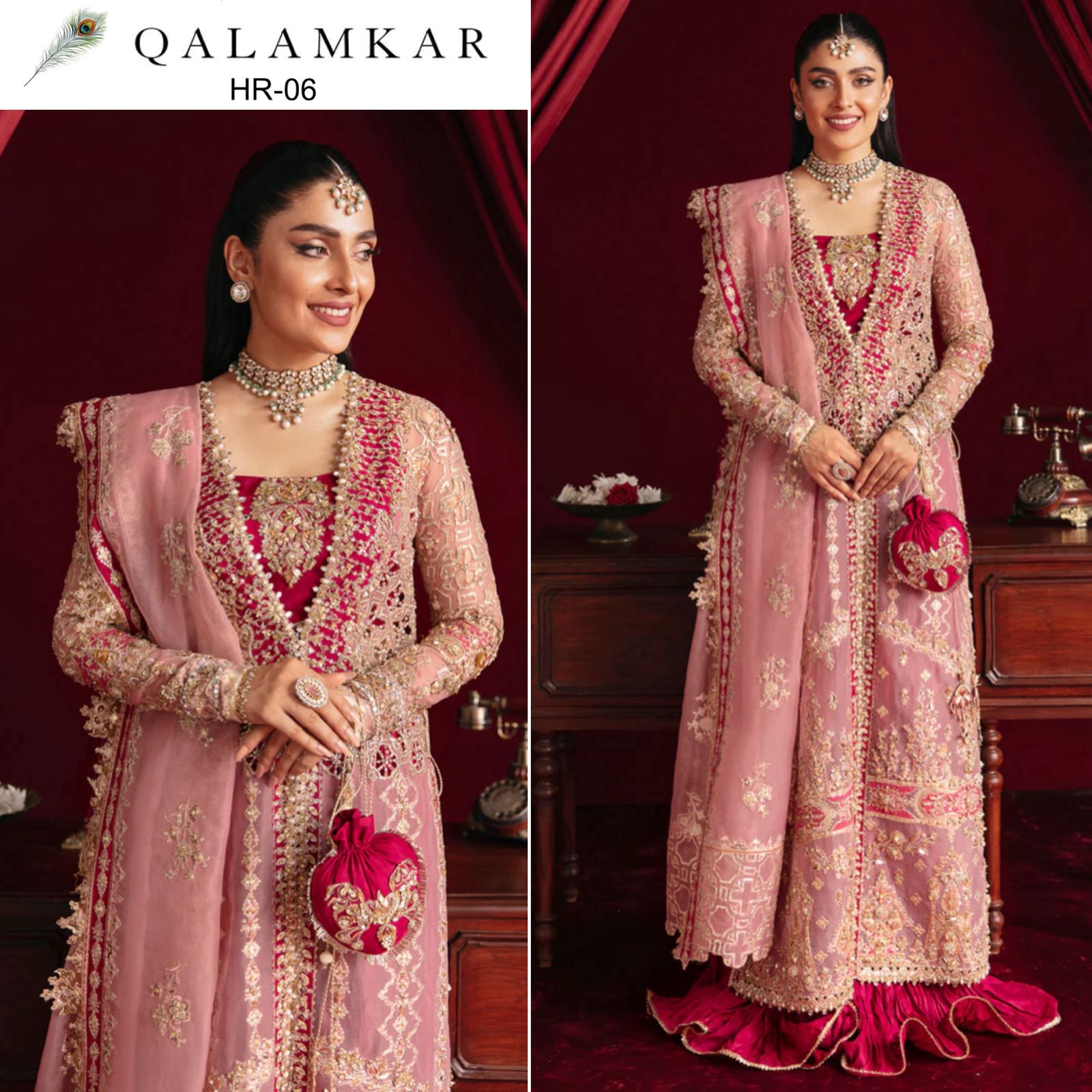 The Qalamkar - Hr06 in a stunning pink with red combination is the perfect addition to your wardrobe. Made with high-quality materials, this garment is sure to provide comfort and style. With its unique design, it's a must-have for any fashion-forward individual. Upgrade your style with Qalamkar.