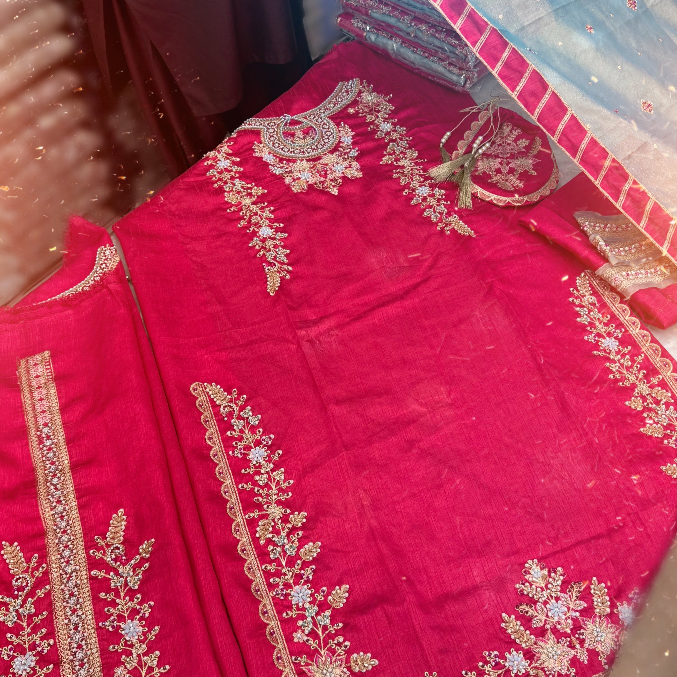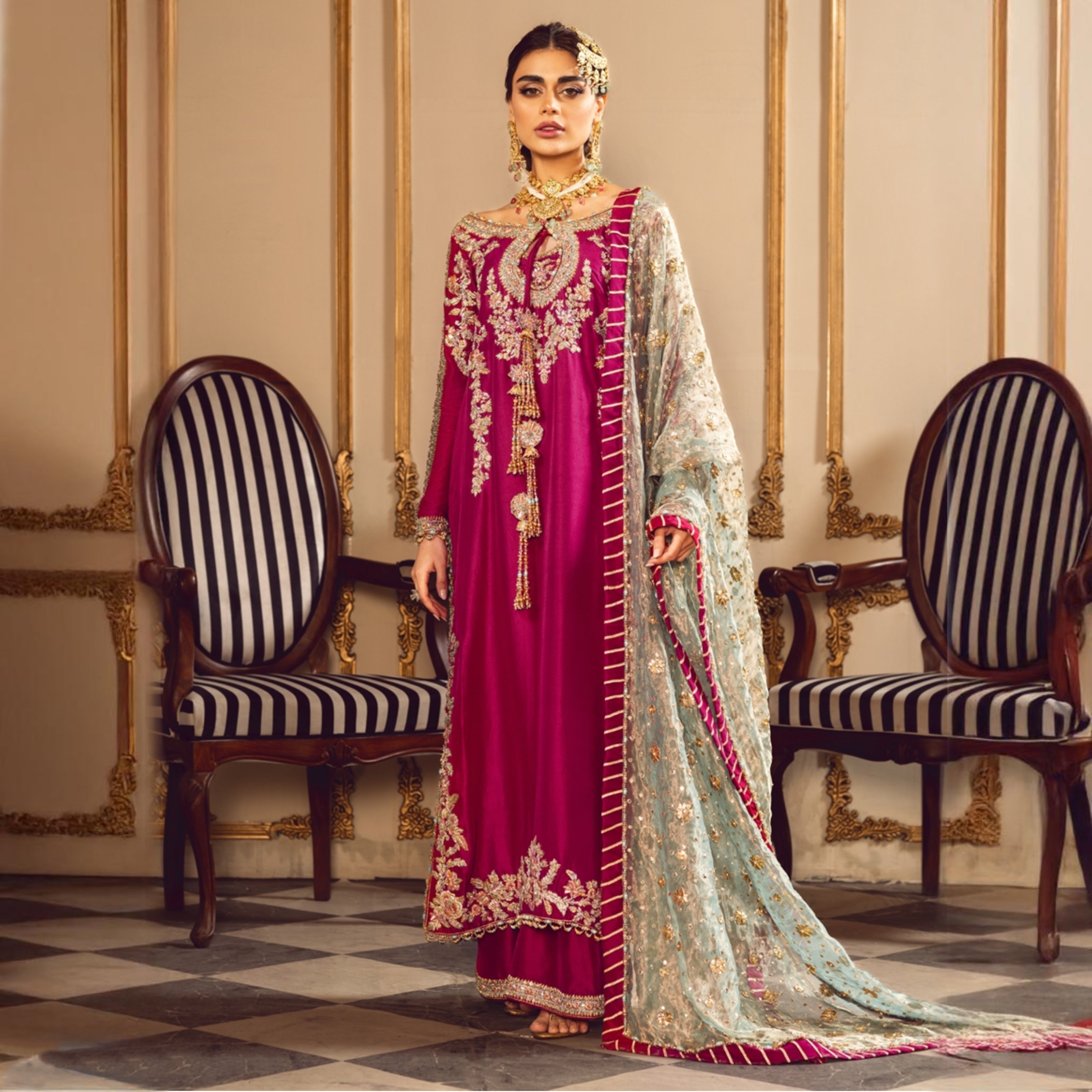 Melodic Tassels a Symphony of Opulence is crafted with meticulous care from pure raw silk, the shirt and pants radiate a lustrous sheen and boast a luxurious texture that enhances the overall allure of the ensemble. Melodic Tassels, with its Aqua Green dupatta, invites you to embrace the enchantment of color and texture. It is an ode to individuality and style, where every element comes together to form a harmonious composition, a melody that resonates with the modern spirit while paying homage to the richness of tradition.