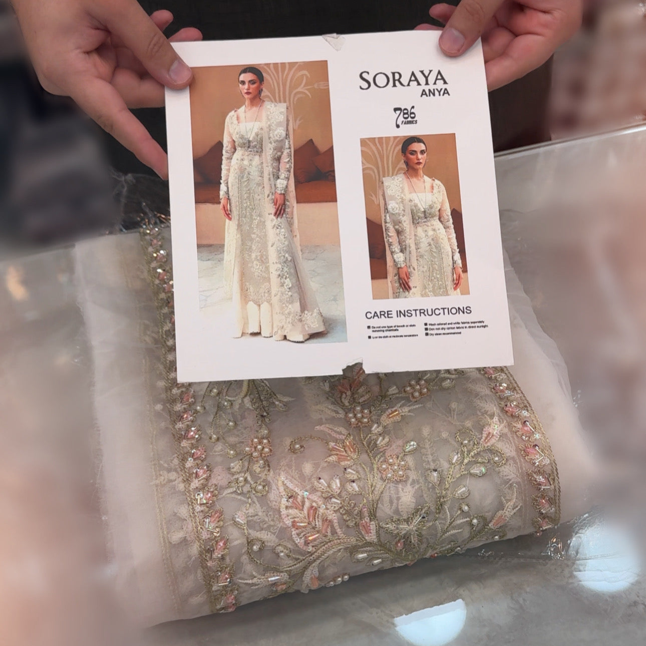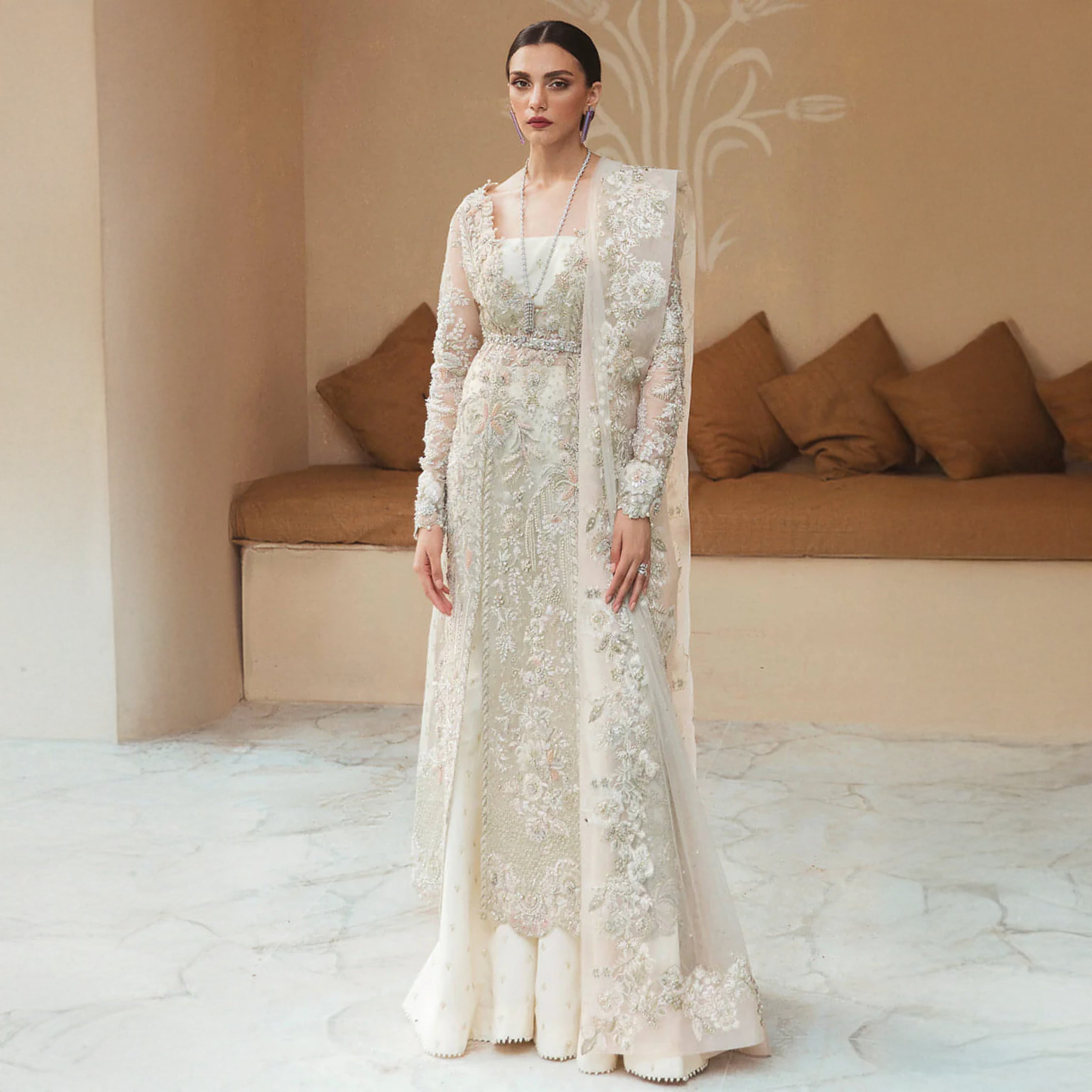 Anya is a handcrafted artistic piece dipped in a white hue celebrating the glory of wedding festivities. A glamoured organza paneled long shirt executed with touches of pink floral 3D work and katdana over the whole canvas further glorified with sequenced pearls and crystals reviving the bridal beauty.