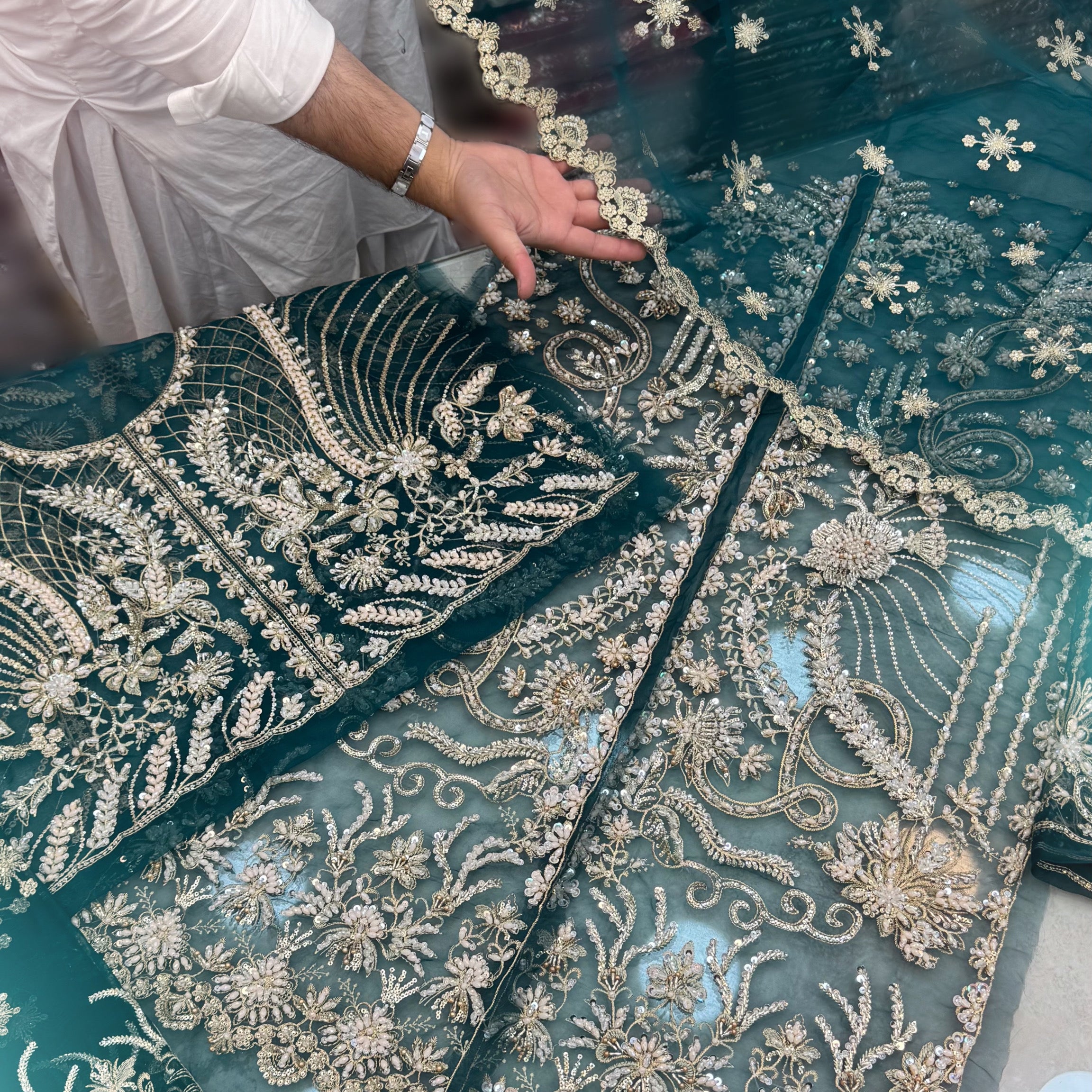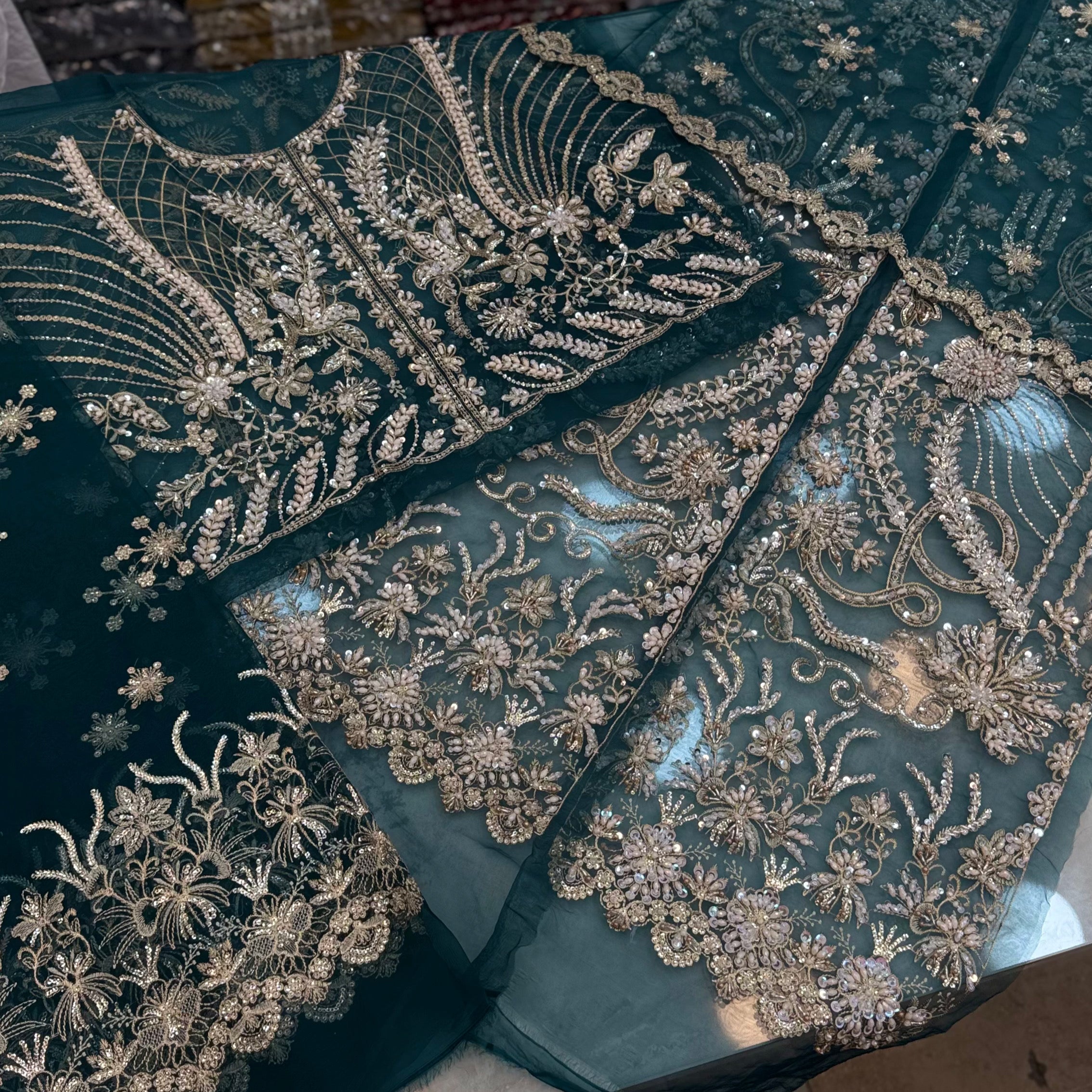 Luxe is a mesmerizing viridescent emerald organza flared gown, adorned with modern, rich silver dhabka, hand beaded details and captivating cape sleeves, elegantly finished with hanging beads paired beautifully with organza duppata heavily embroidered on borders. The ensemble is perfectly complemented by sleek raw silk trousers.