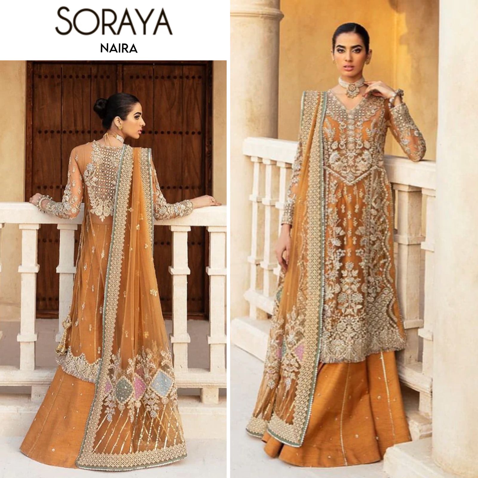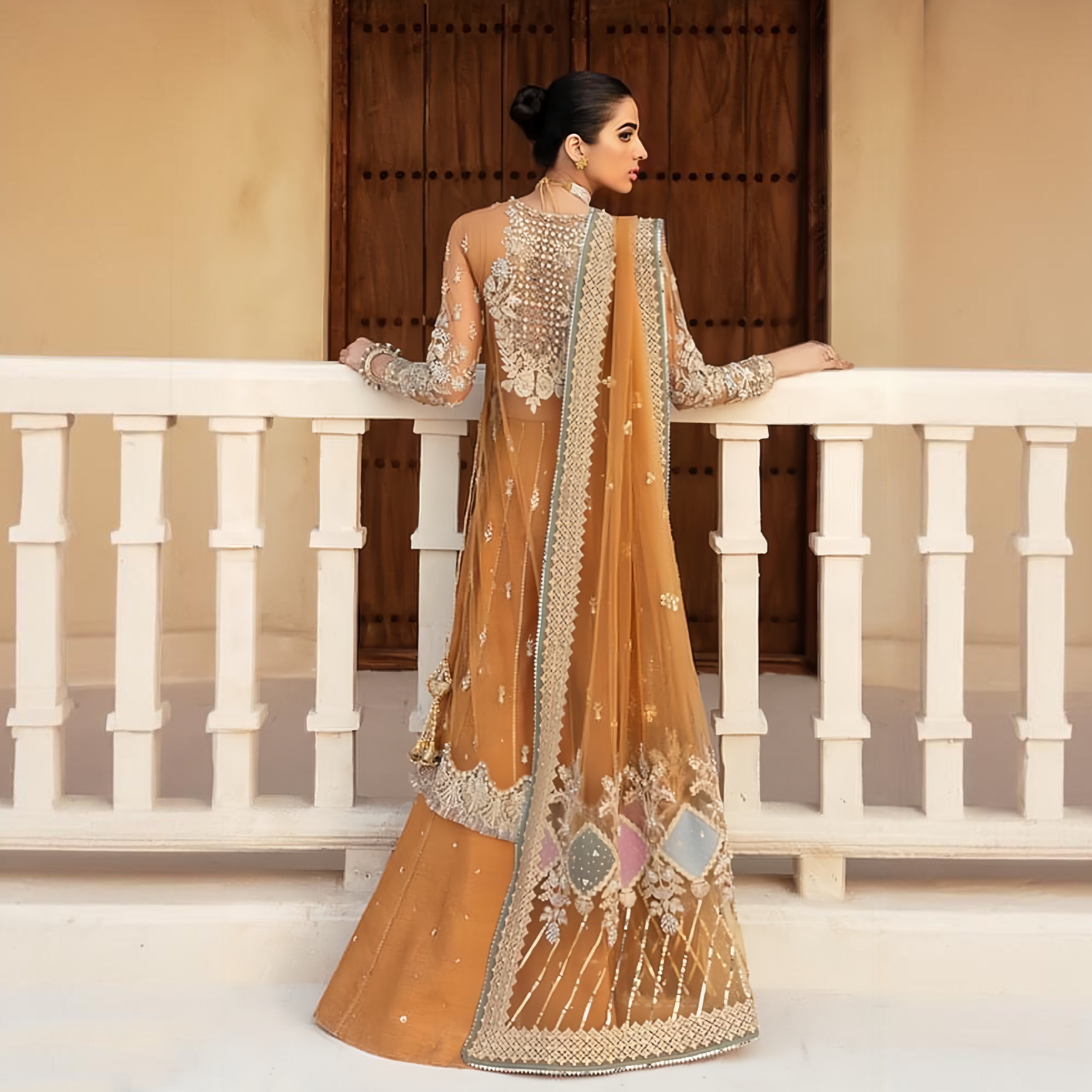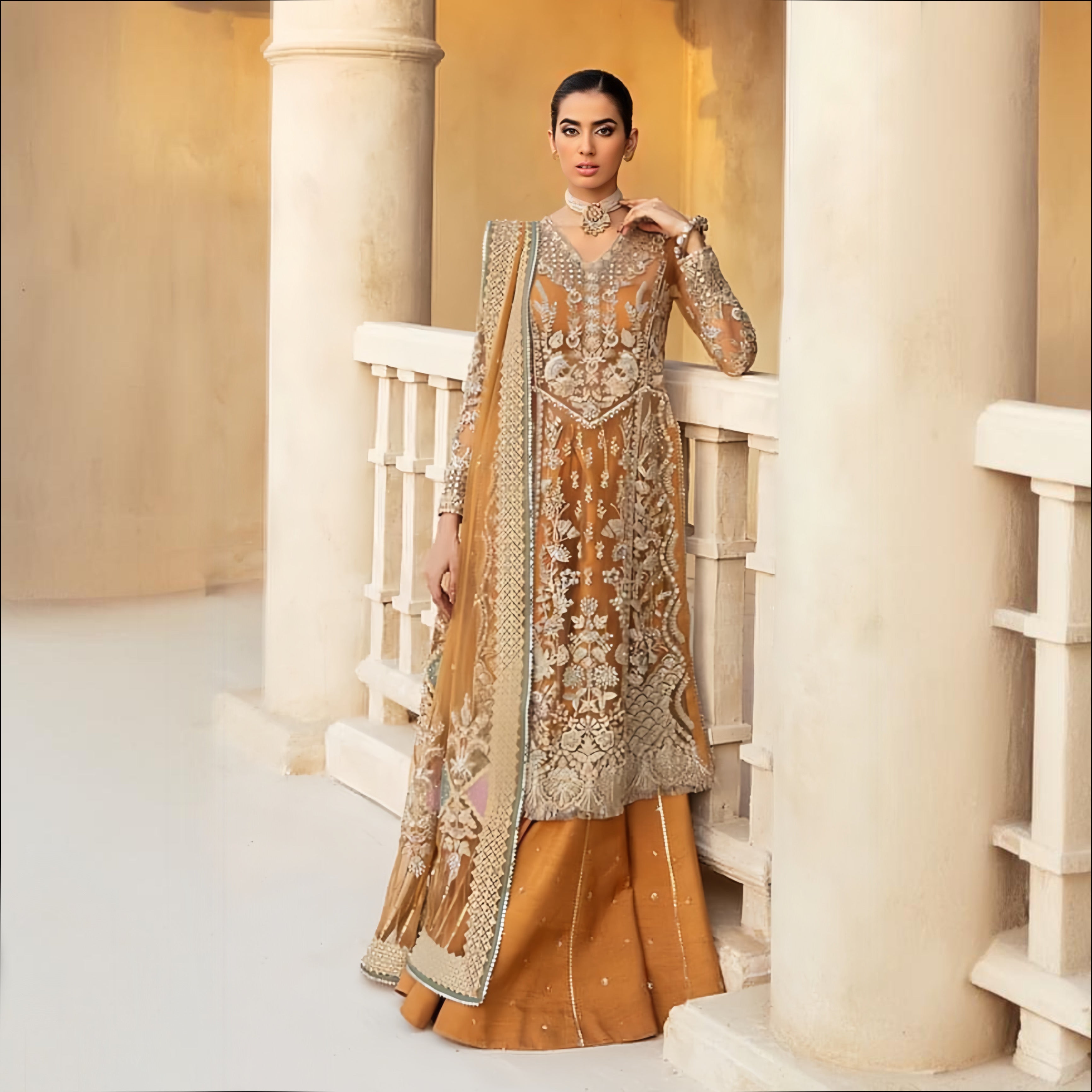 Rust never looked so ravishing! Introducing our breathtaking Naira festive formal dress, in the rich hue of rust, this gown is truly a delicate composition, with its attention to detail and exquisite craftsmanship paired with a gleaming sharara. From the moment you slip into this standout piece of Sarang bridals and Formals, you'll feel like the most beautiful and confident version of yourself. The gotta and dabka naqshi work on this dress adds a touch of sparkle, and the delicate pink and lilac threads used in the embroidery work add a feminine touch to the entire ensemble. Naira is the ideal choice for you to keep it trendy yet traditional.