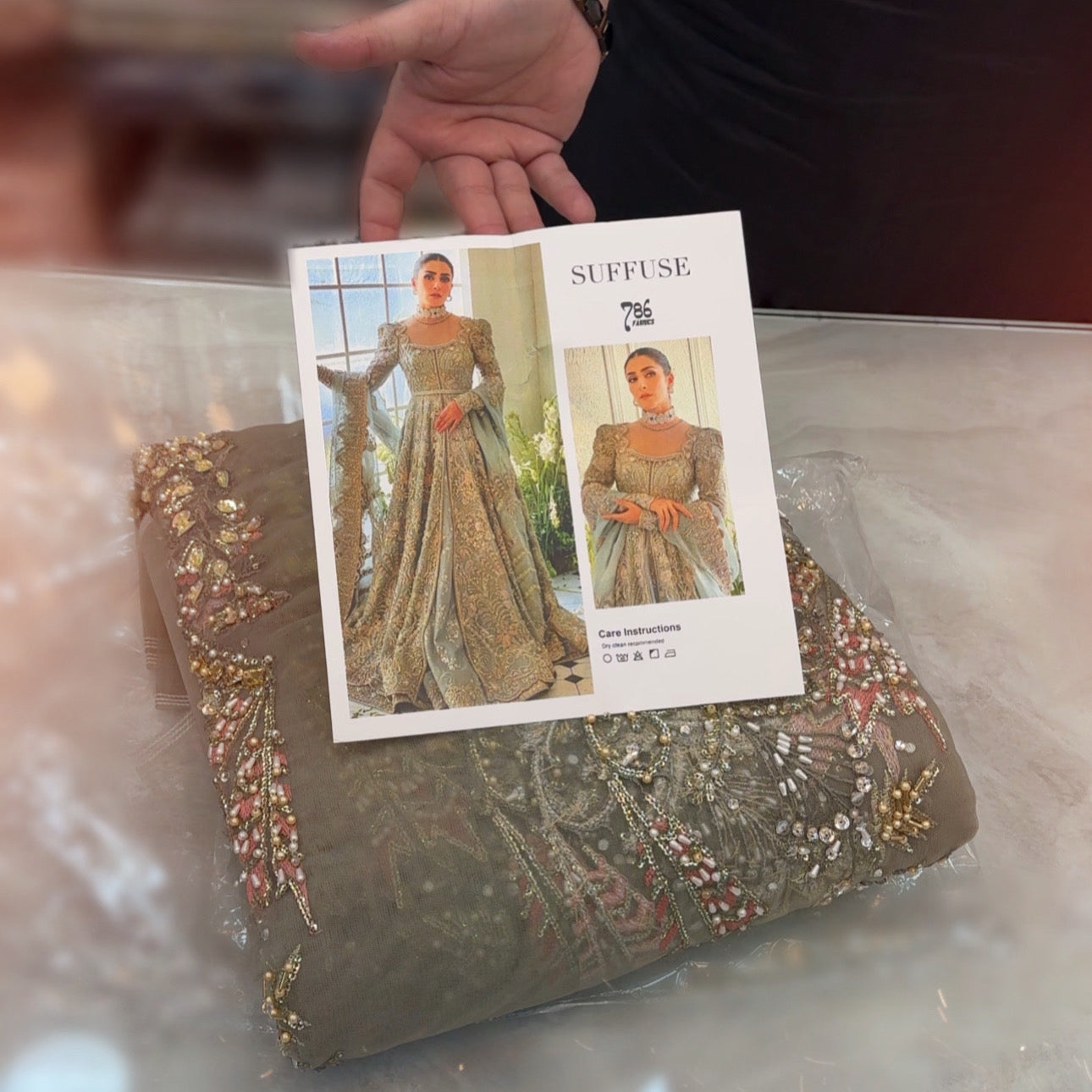 The Suffuse Couture dress, made from Bareeze Net fabric, features a stunning 16-panel design with intricate handwork, including pearls, sequins, and embroidered borders. It comes with a 2.5-meter net dupatta adorned with matching embellishments blending traditional craftsmanship with modern elegance for a truly luxurious look.